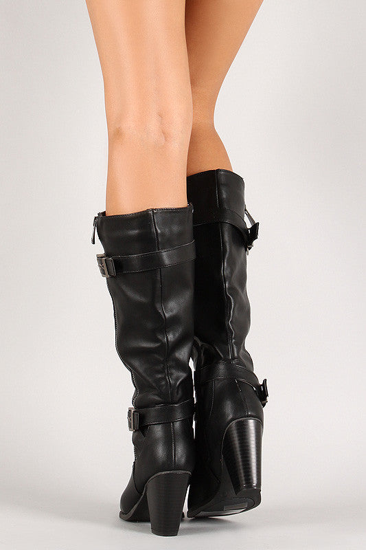 Featuring almond toe, side zipper decor, two adjustable buckle straps, stitching detail, full side zipper closure, chunky stacked heel, faux fur inner lining, and finished with lightly padded insole.
