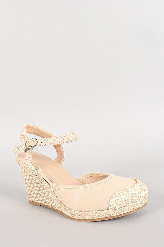 Featuring smooth nubuck/woven fabric upper, espadrille trim, round toe, scooped vamp, slingback with adjustable buckle closure, wedge heel, and finished with cushioned insole for comfort.