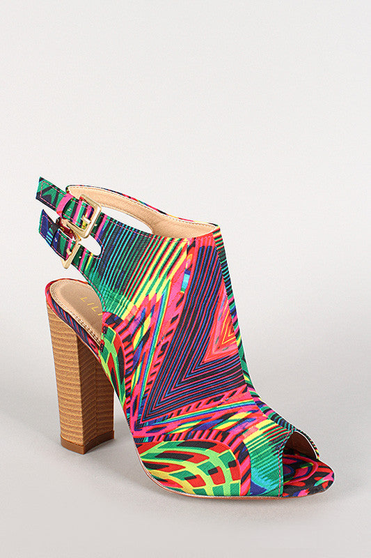 Featuring abstract print, peep toe, back cut-out with two buckle straps, stitching detail, chunky heel, and finished with cushioned insole for comfort.