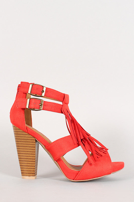 Featuring faux suede upper, open toe, cut out front with fringe detail, double adjustable buckle closure, chunky stacked heel, and lightly padded insole.