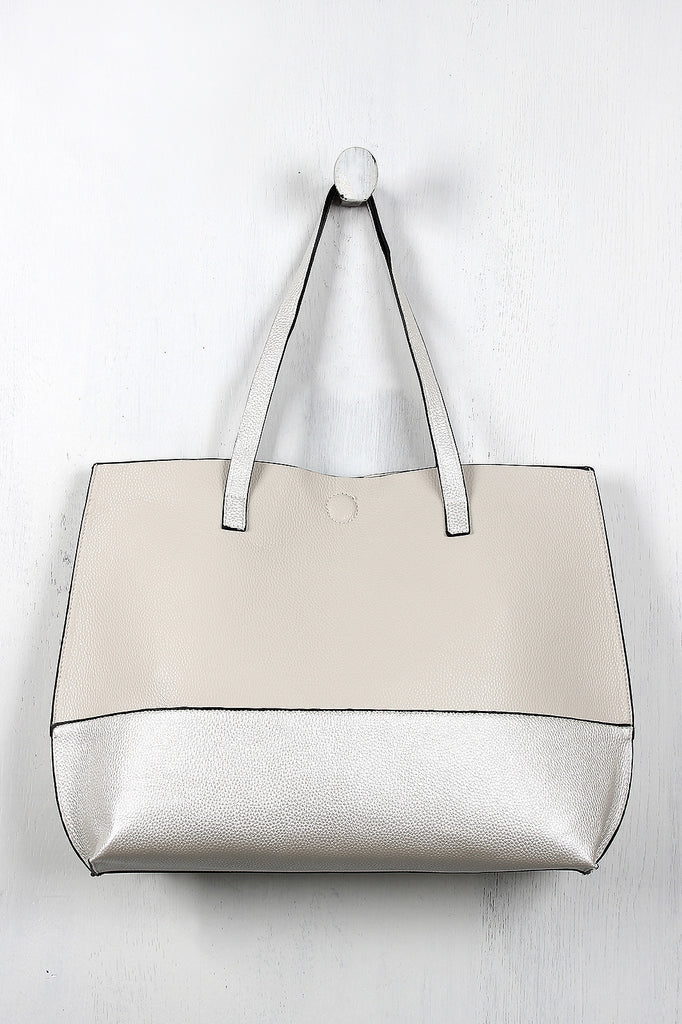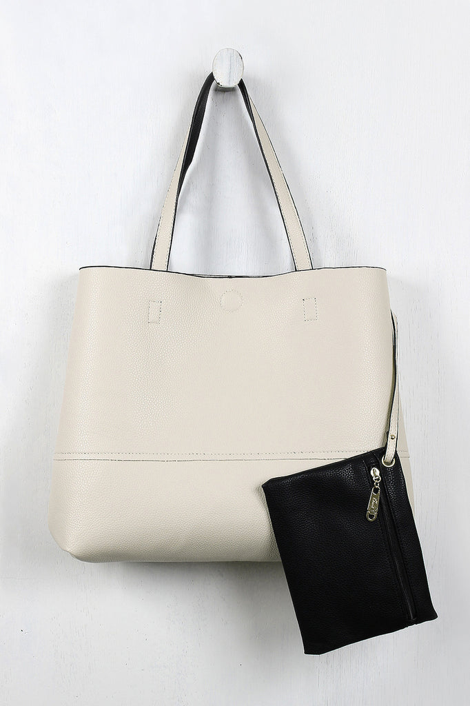 This pebbled leatherette tote bag features a two-tone color block design one side, solid color on the reverse, and black piping detail. The wide top has a single magnet closure and the solid color side of the bag has an attached zippered pouch. The two flat shoulder straps have a generous 10" drop. Includes large zippered pouch with adjustable shoulder strap.