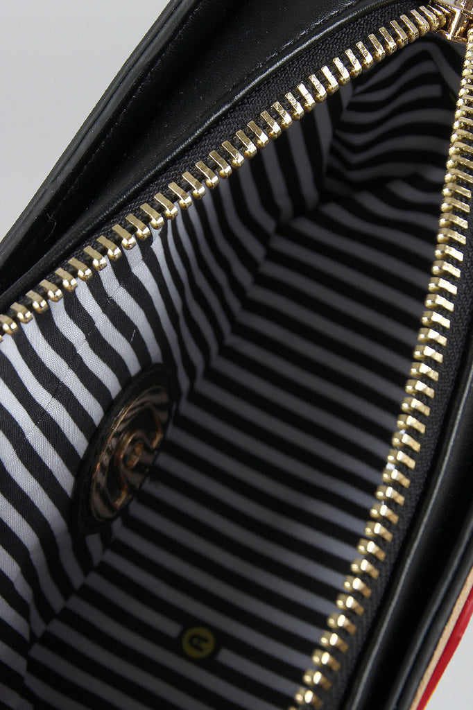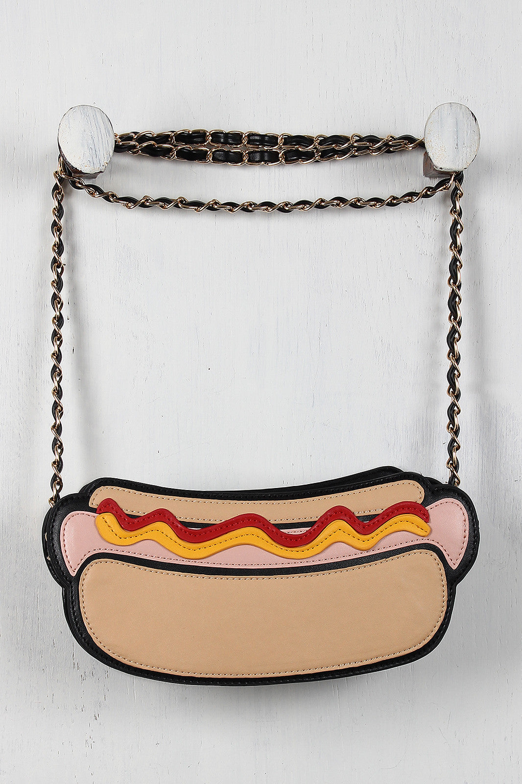 Attention all foodies! This whimsical bag features a delicious hot dog design in smooth leatherette, large gold-tone zipper closure, and threaded chain shoulder strap with a 23.5" drop.