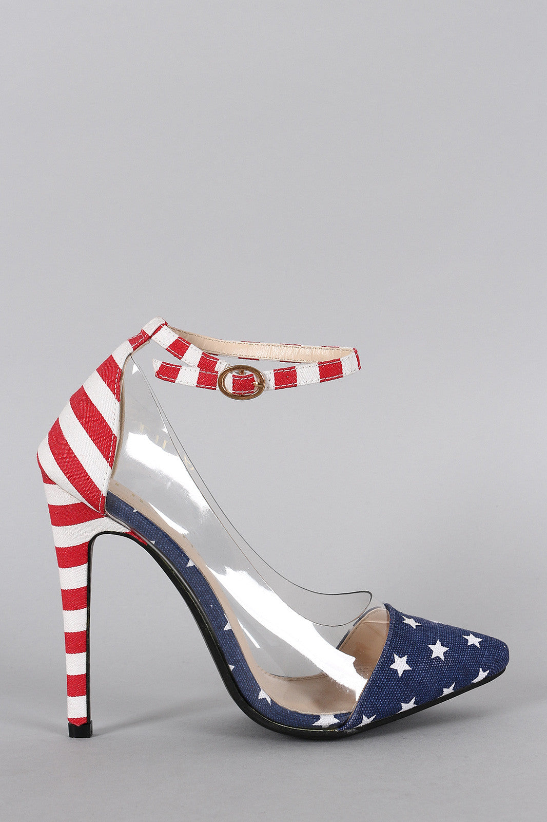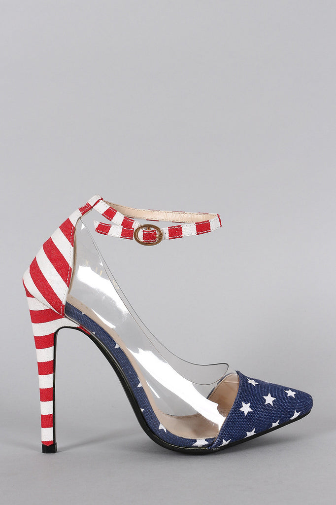 This beautiful pump features a combination of American Flag print canvas/lucite upper, pointy toe, and wrapped stiletto heel. Finished with lightly padded insole and adjustable ankle strap with buckle closure.