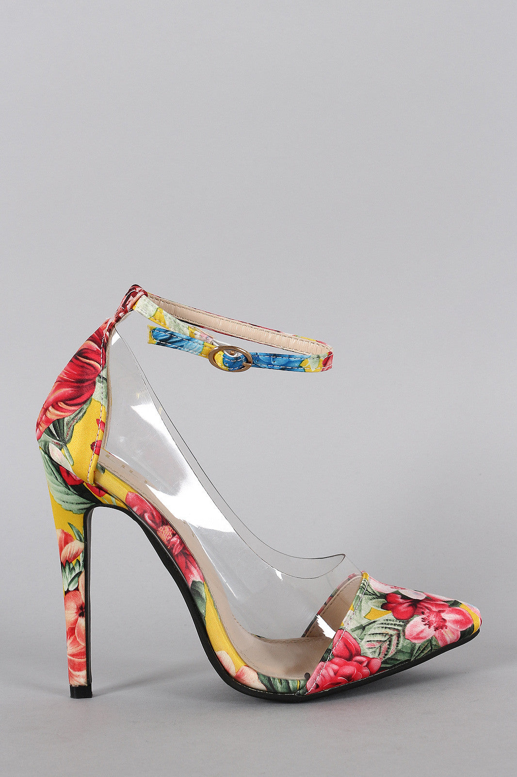 This beautiful pump features a combination of floral print satin/lucite upper, pointy toe, and wrapped stiletto heel. Finished with lightly padded insole and adjustable ankle strap with buckle closure.
