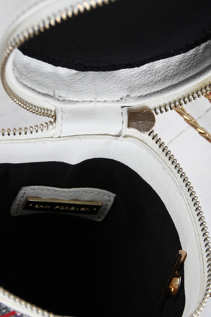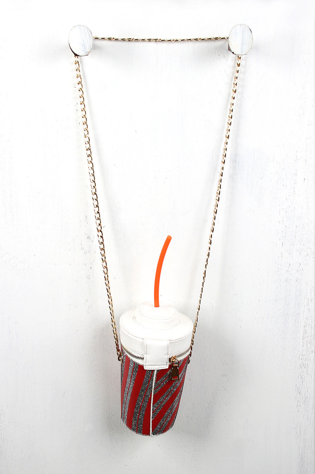 Quench your thirst for style with this novelty soda bag! Featuring colorful and metallic leatherette, zippered top, and flat curb link chain shoulder strap with 22"drop. Finished with full interior lining.