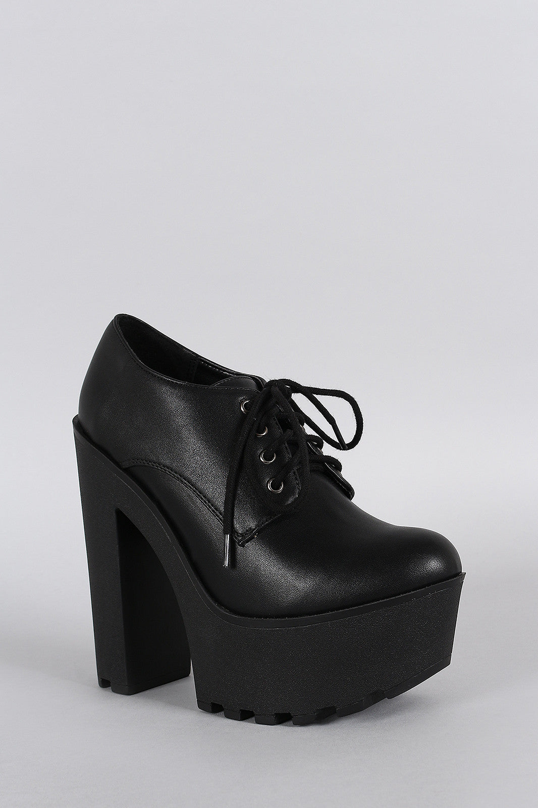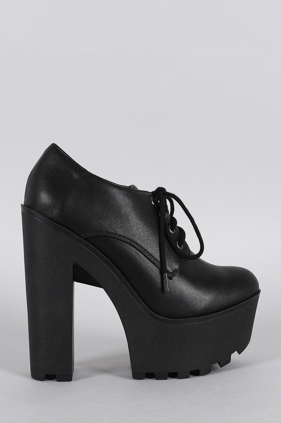 This platform lug sole platform heel, lightly cushioned insole, and lace up closure.