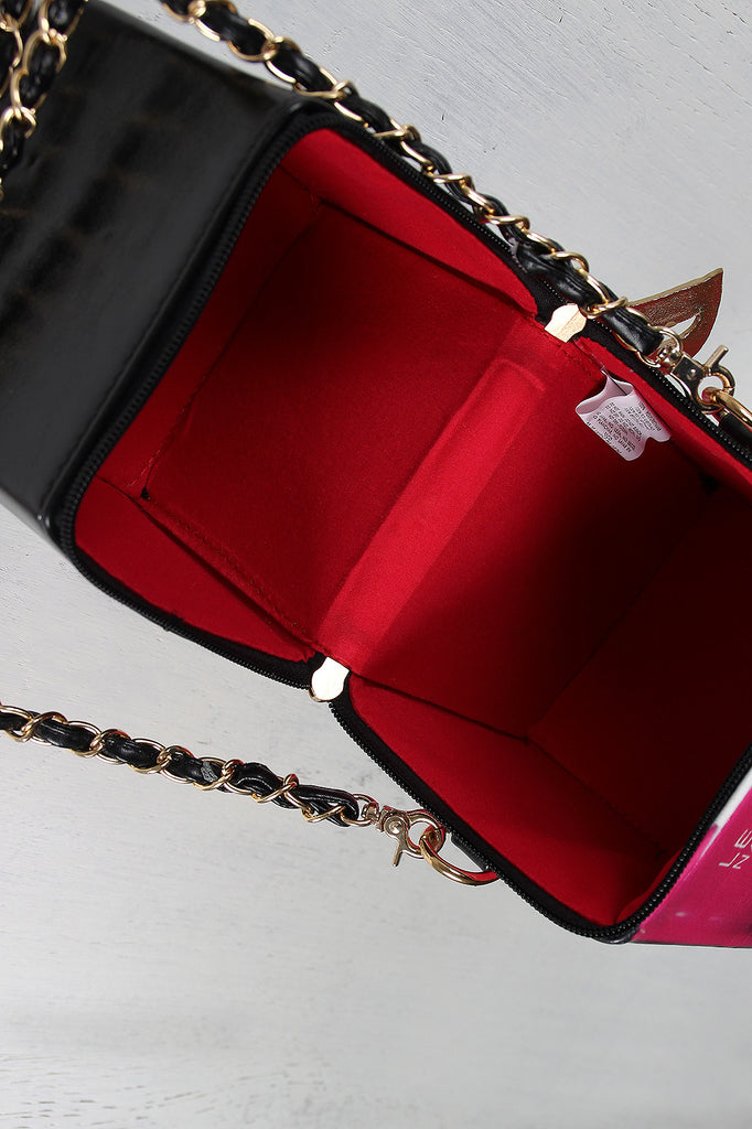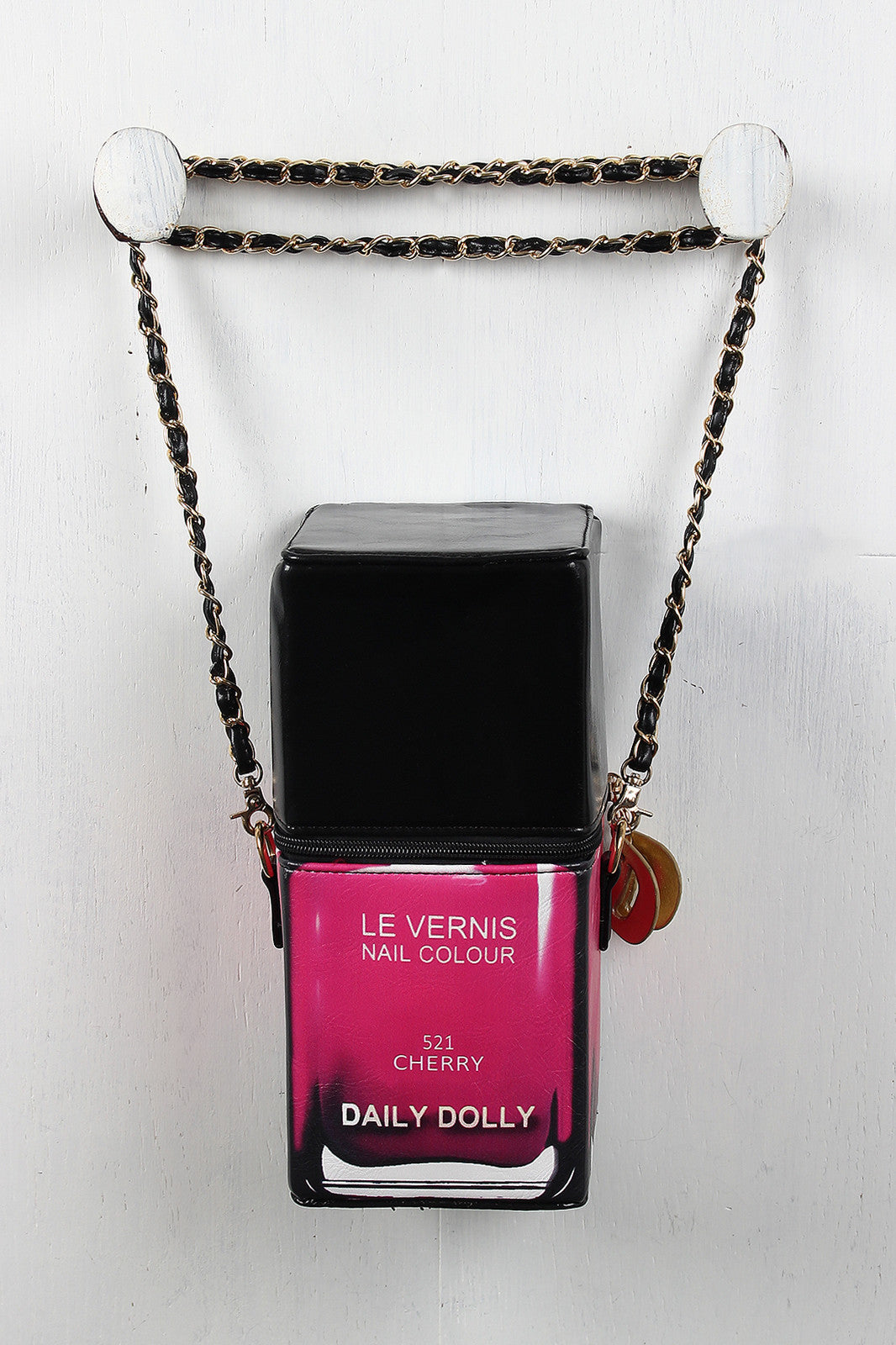 A boxy bag with nail polish bottle design, zipper closure, and detachable threaded shoulder chain with 20" drop. Includes metallic leatherette "D" zipper pulls and fully lined interior.