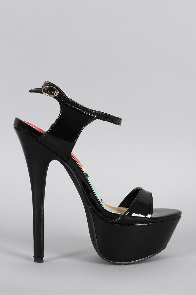 This glossy heel features an open toe silhouette, single band across vamp, and stiletto heel. Finished with lightly padded insole and adjustable ankle strap with buckle closure.