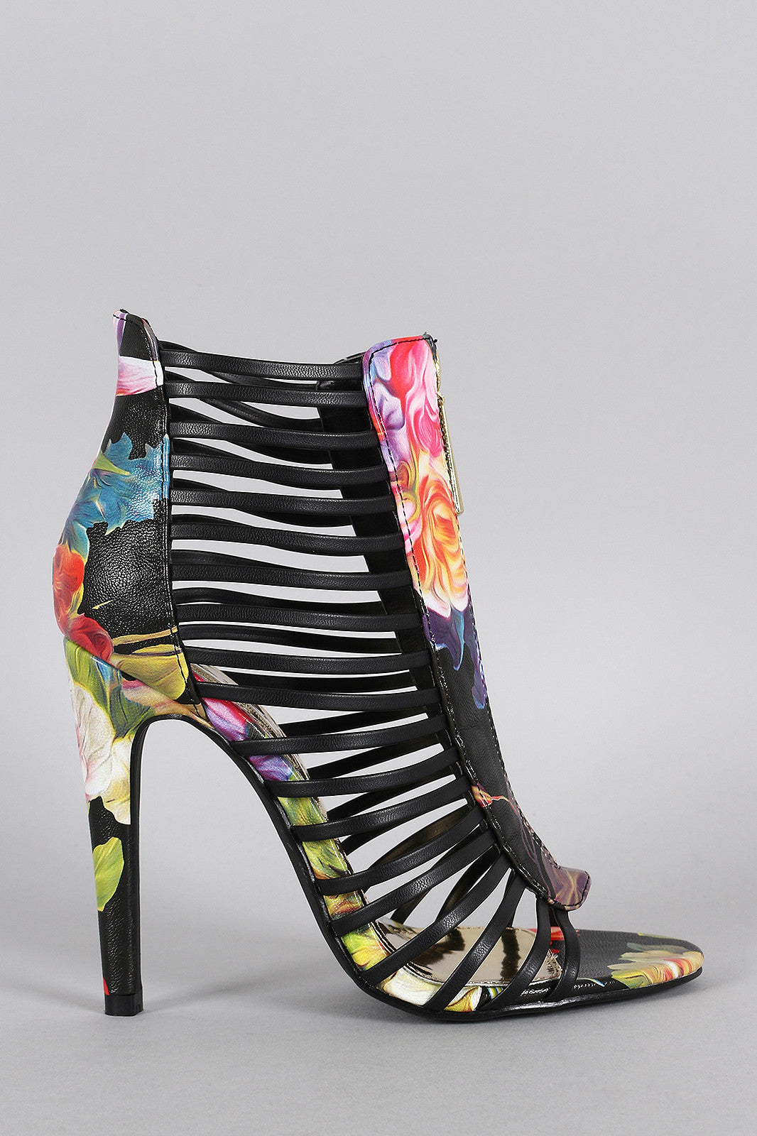 This lovely heel features an open toe silhouette, combination of floral print leatherette with strappy caged design upper, and front zipper closure for easy on/off. Finished with lightly padded insole and wrapped stiletto heel.