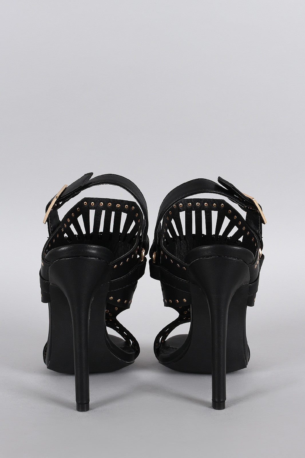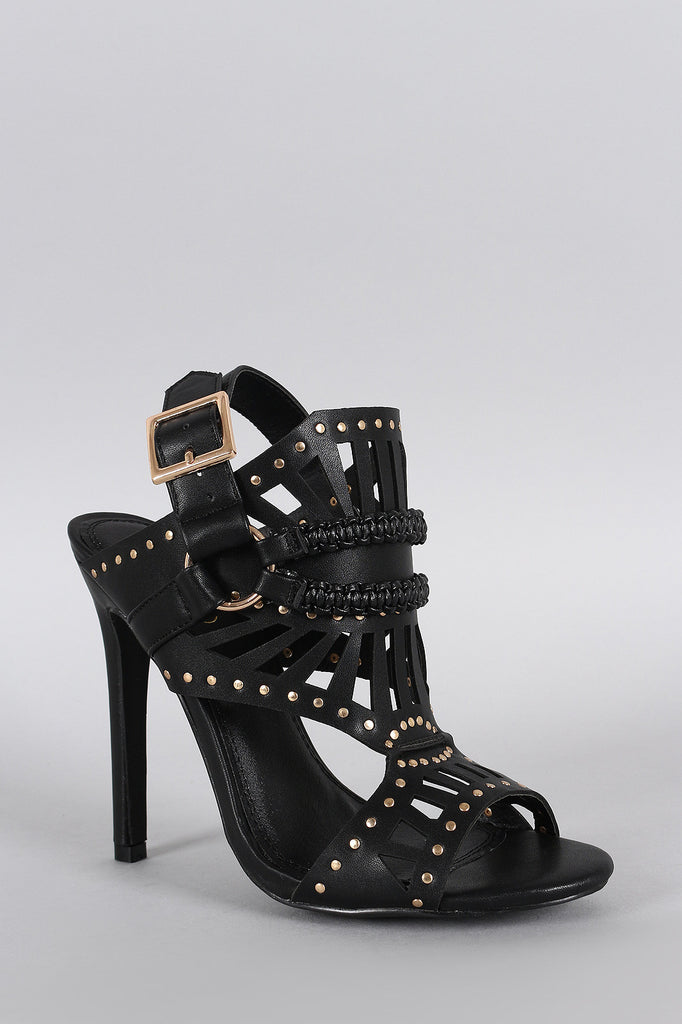 Cutout open toe heel with round stud embellishments, braided straps at front, and ankle strap with adjustable buckle closure.