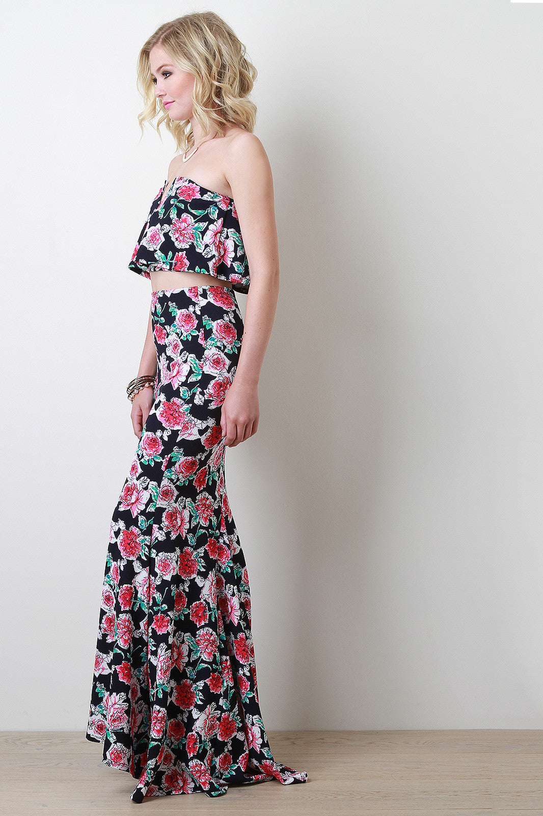 This strapless design with an elasticized band. Features a tube top underlay with a flowy overlay. Finished with V-neckline bonding.Designed with floral print throughout. Accessories sold separately. 96% Rayon. 5% Spandex.