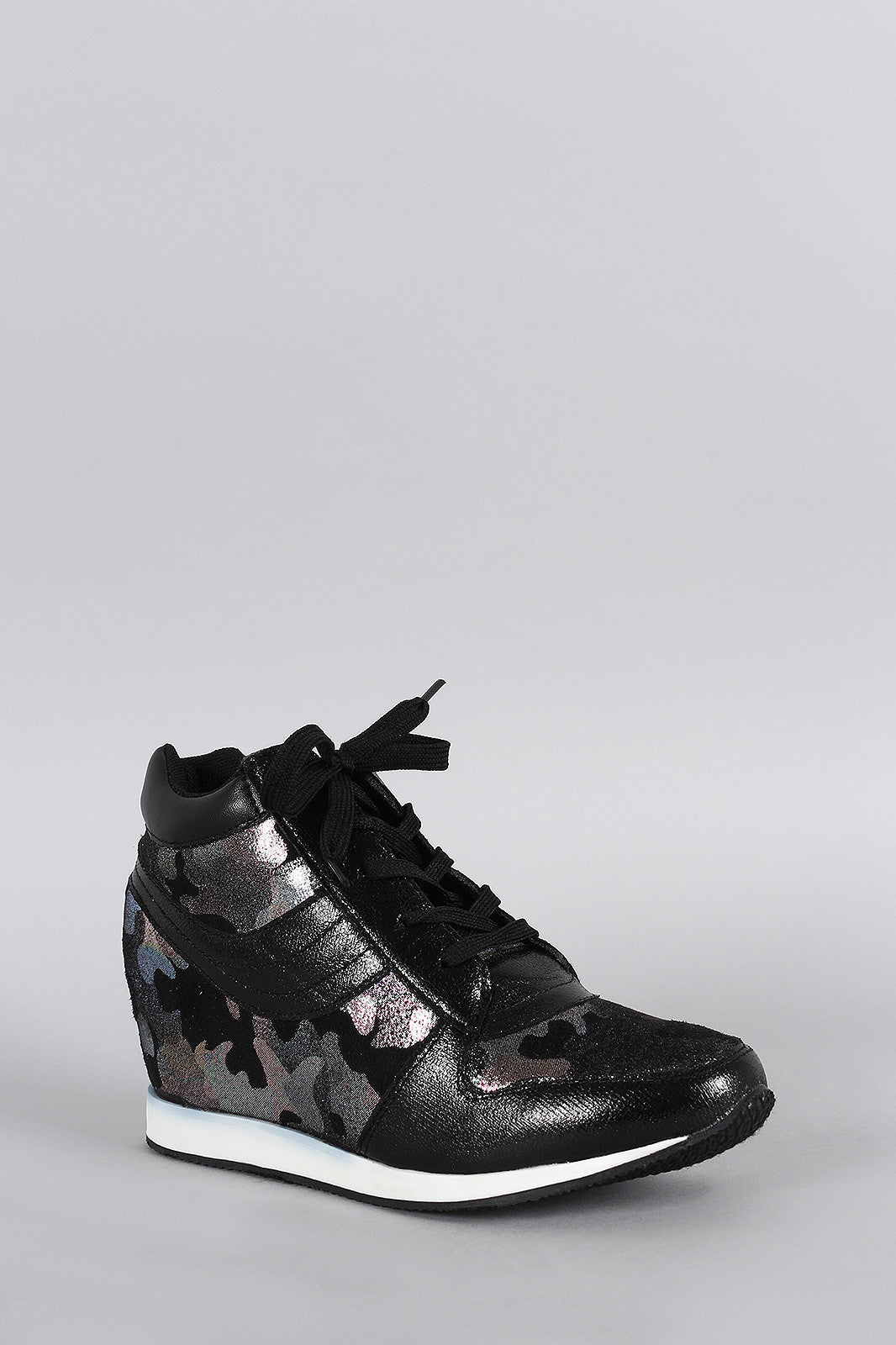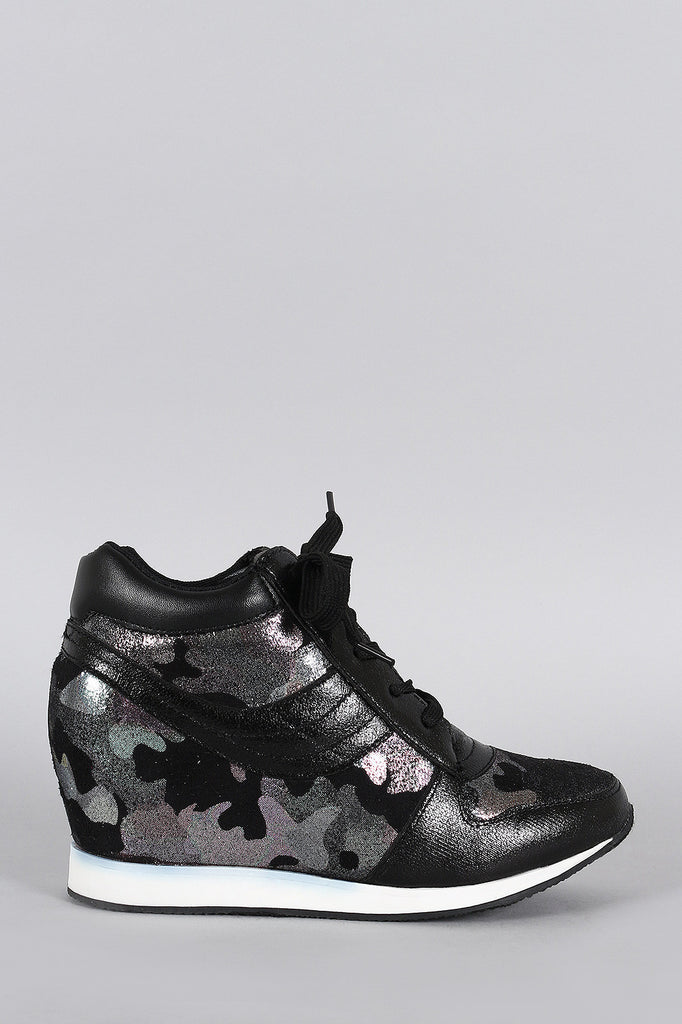 This lace up  sneaker  was designed with a combination of a sold color and a glittered camouflage pattern. Designed with a hidden wedge and a cushioned high top.