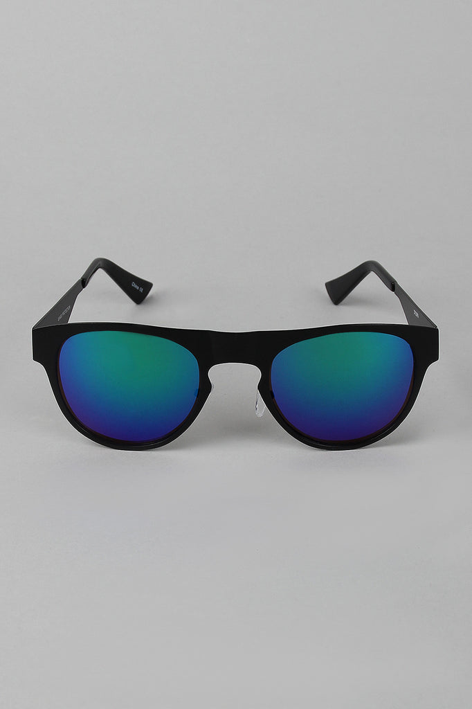 Sunglasses with smooth metal frame and colorful reflective lenses.