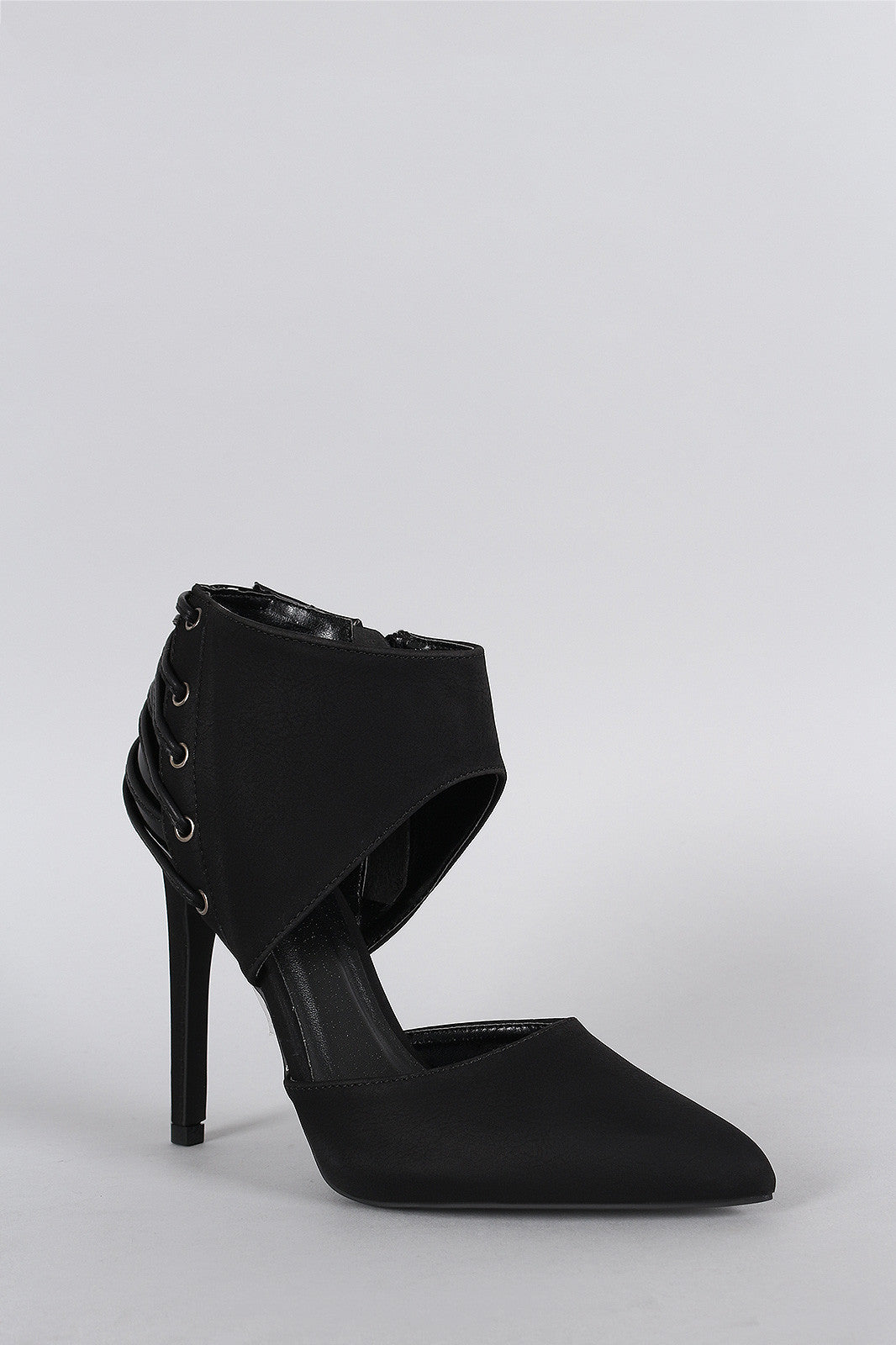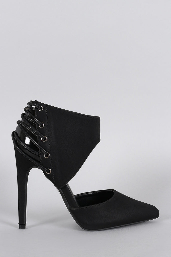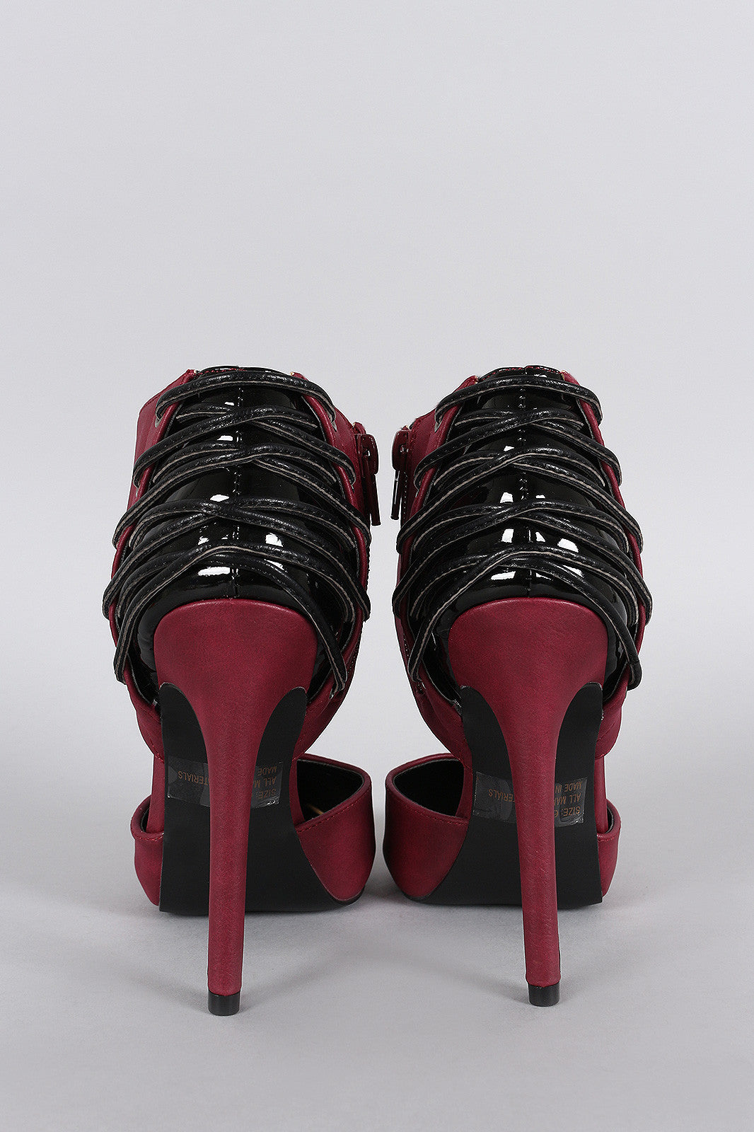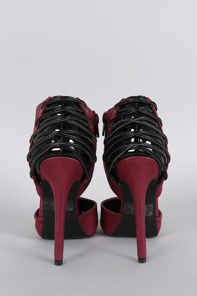 This pump features intertwined straps on a patent material along the rear. The ankle cuff is finished with a side zipper for easy on-off wear.