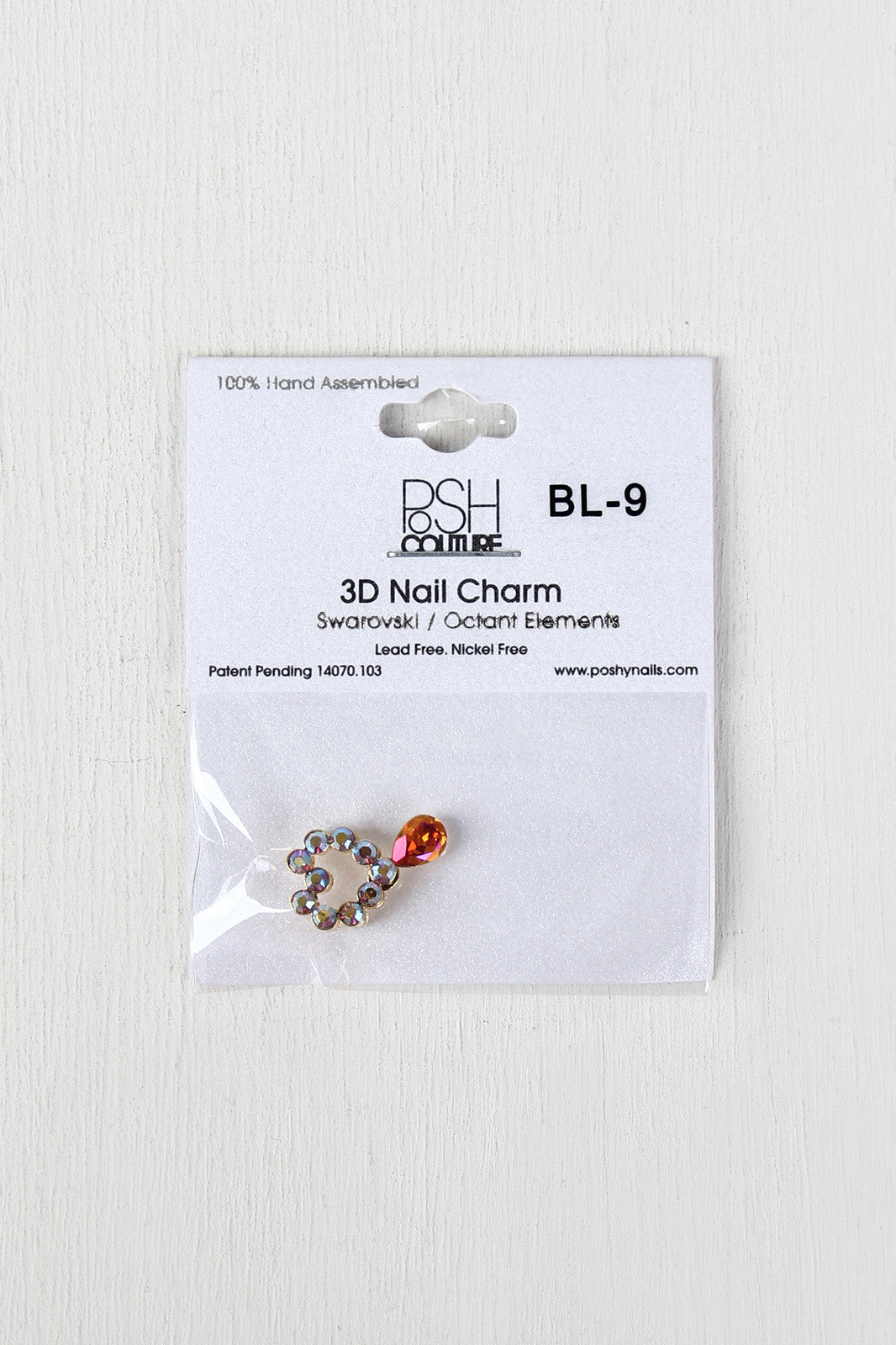 This nail charm features a heart shape constructed from iridescent rhinestones and a hanging drop-shaped stone. Charm is reusable, so mix and match for different looks!