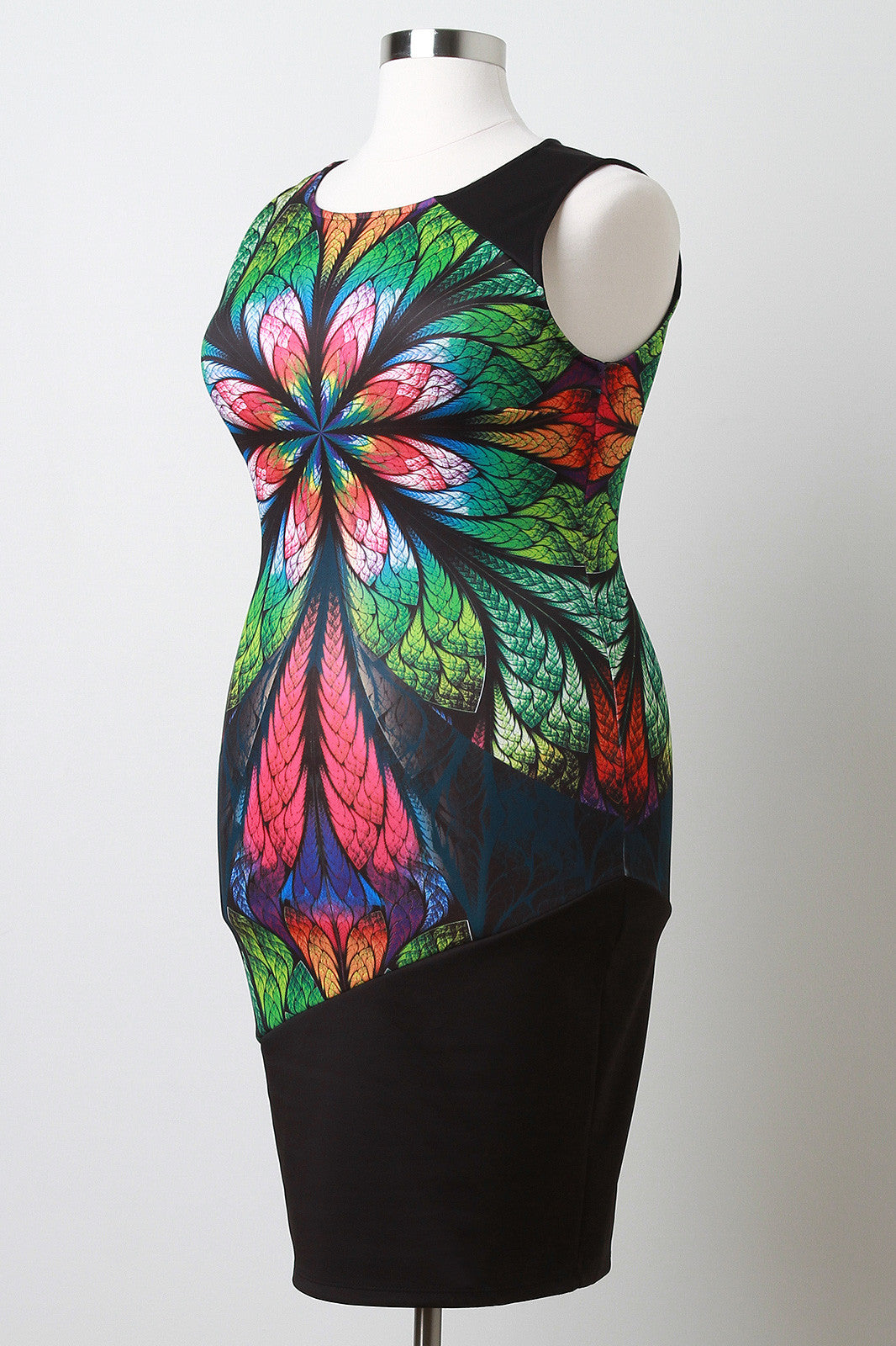 Bodycon plus size dress featuring a multicolor wheat print, paneled design, round neckline, and smooth stretchy fabric for sculpture fit. Accessories sold separately. Made in U.S.A. 95% Polyester, 5% Spandex.