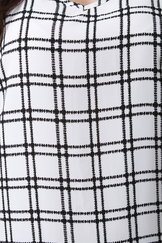 This lightweight shift dress features a contrasting grid print throughout. It is v-neckline with short sleeves. Finished with a pleated back accent. Available in Plus Sizes . Accessories sold separately. 100% Polyester.