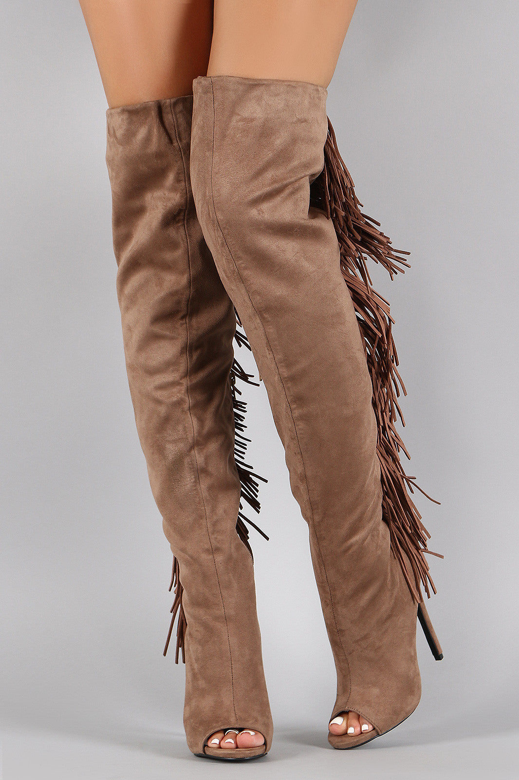 Privileged Suede Fringe Peep Toe Stiletto Thigh High Boot