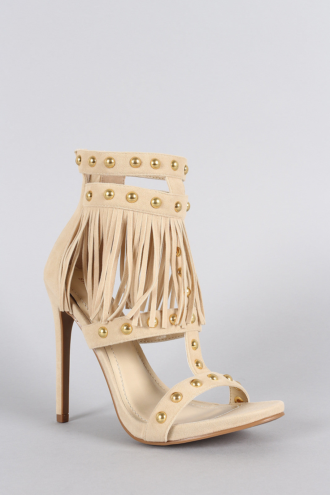 Shoe Republic LA Fierce Fringe Studded Open Toe Heel