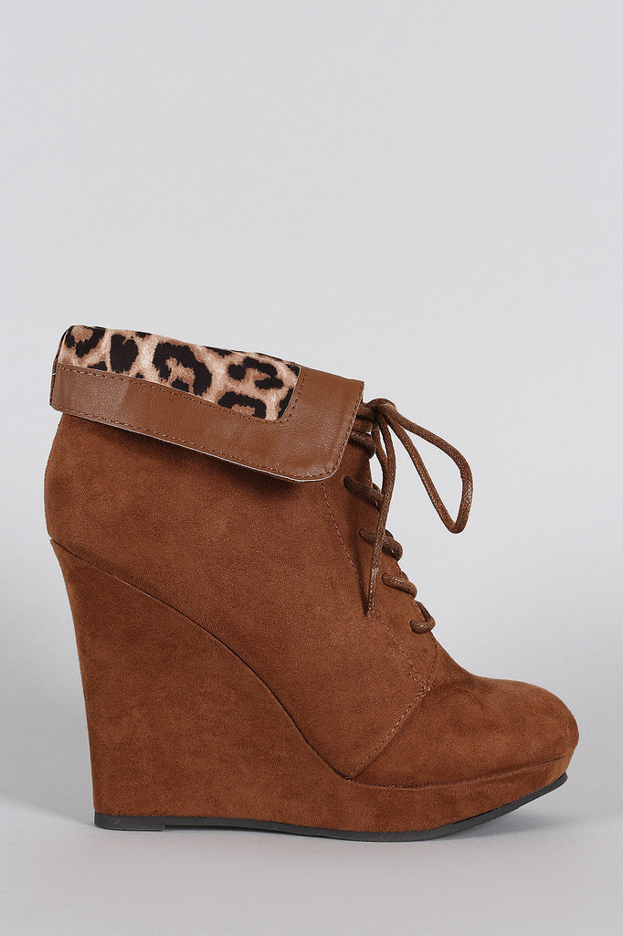 Qupid Suede Leopard Collar Round Toe Lace Up Wedge Booties