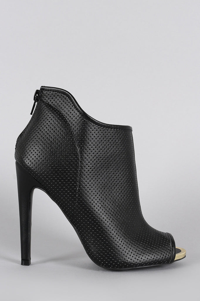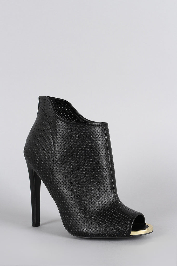 Qupid Asymetrical Collar Perforated Peep Toe Stiletto Booties