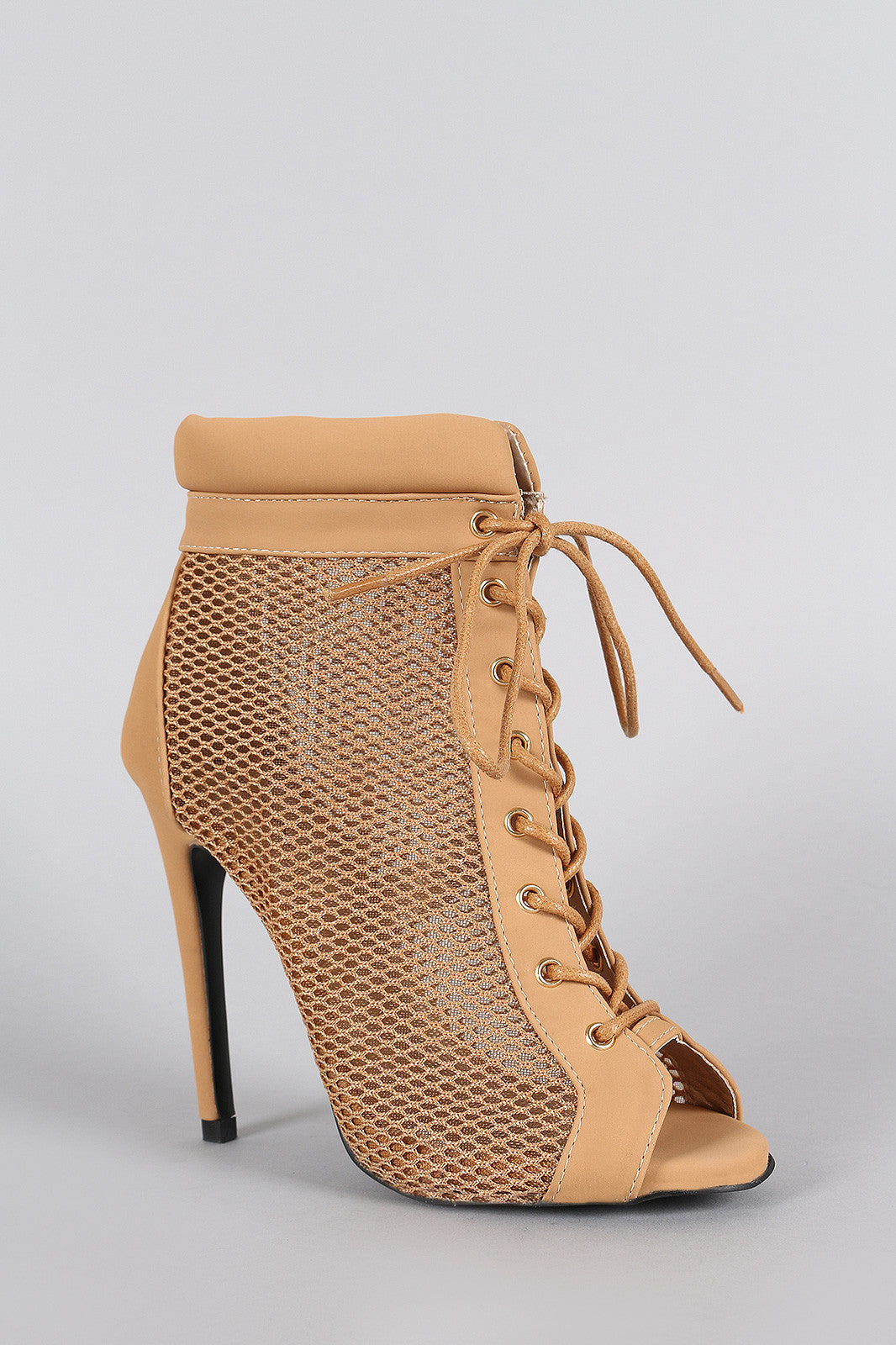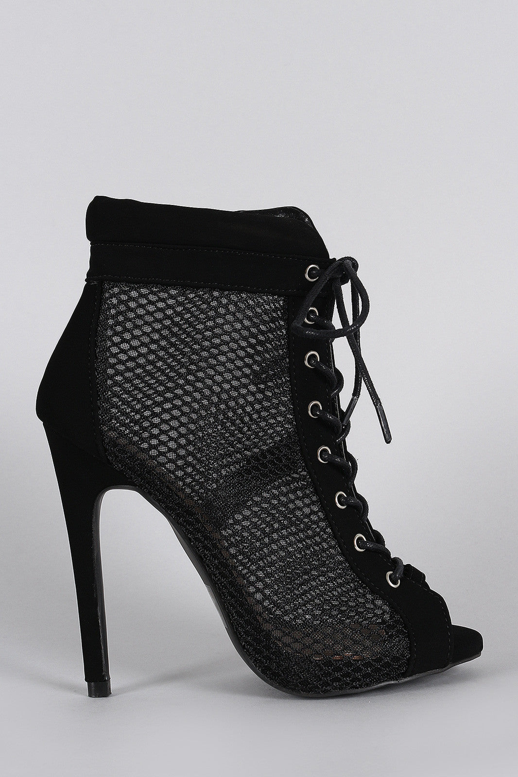 These lace up booties are mesh design, featuring peep toe openings and padded collars. Finished on leg-lengthening stiletto heels.