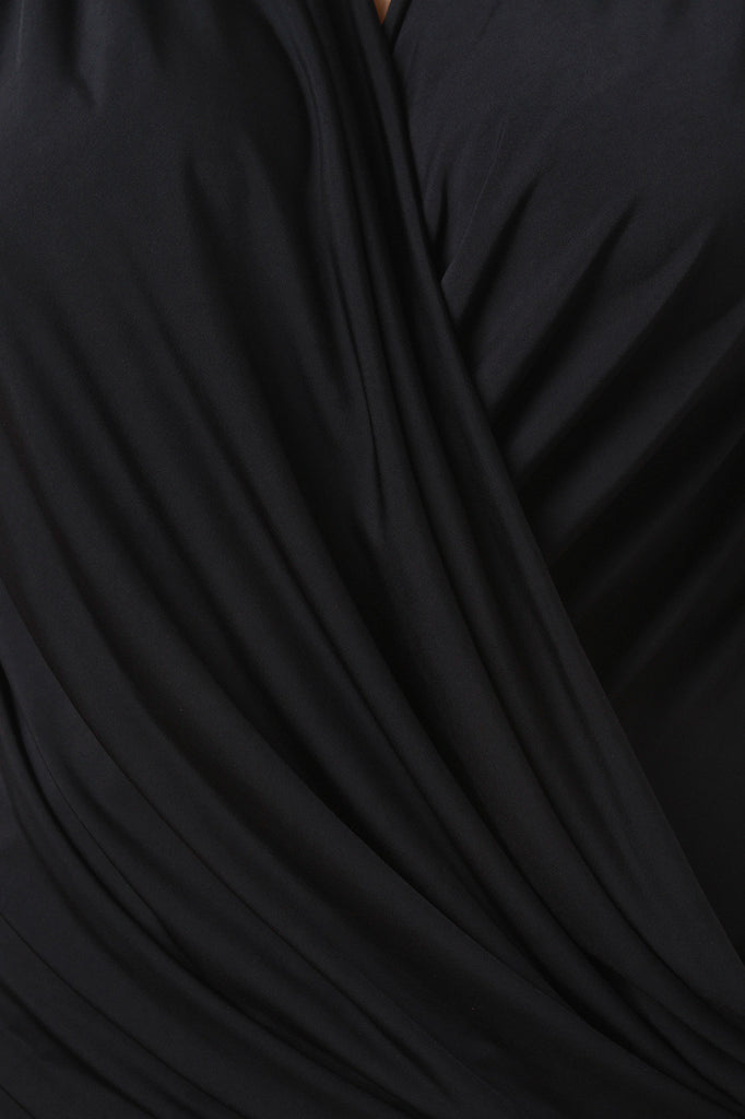 This plus size sleeveless mini dress is surplice draped bodice with ruched touches to emulate a curve hugging design. Accessories sold separately. 95% Polyester. 5% Spandex.