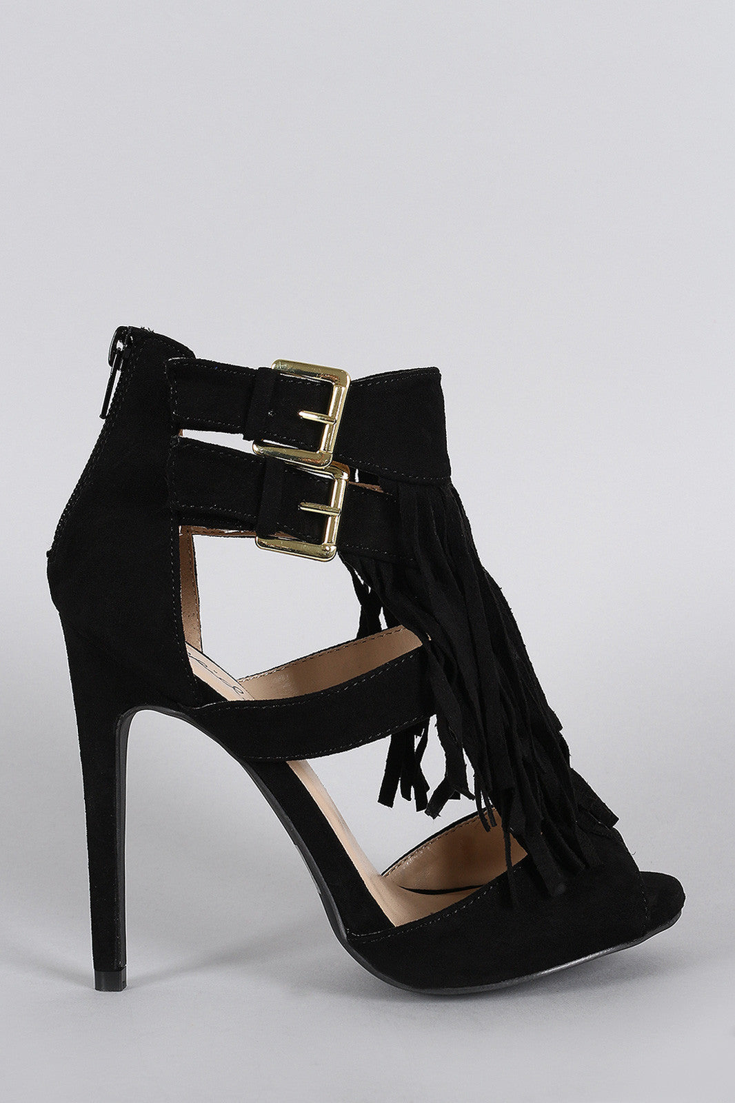 Qupid Double Buckle Falling Fringe Peep Toe Heel