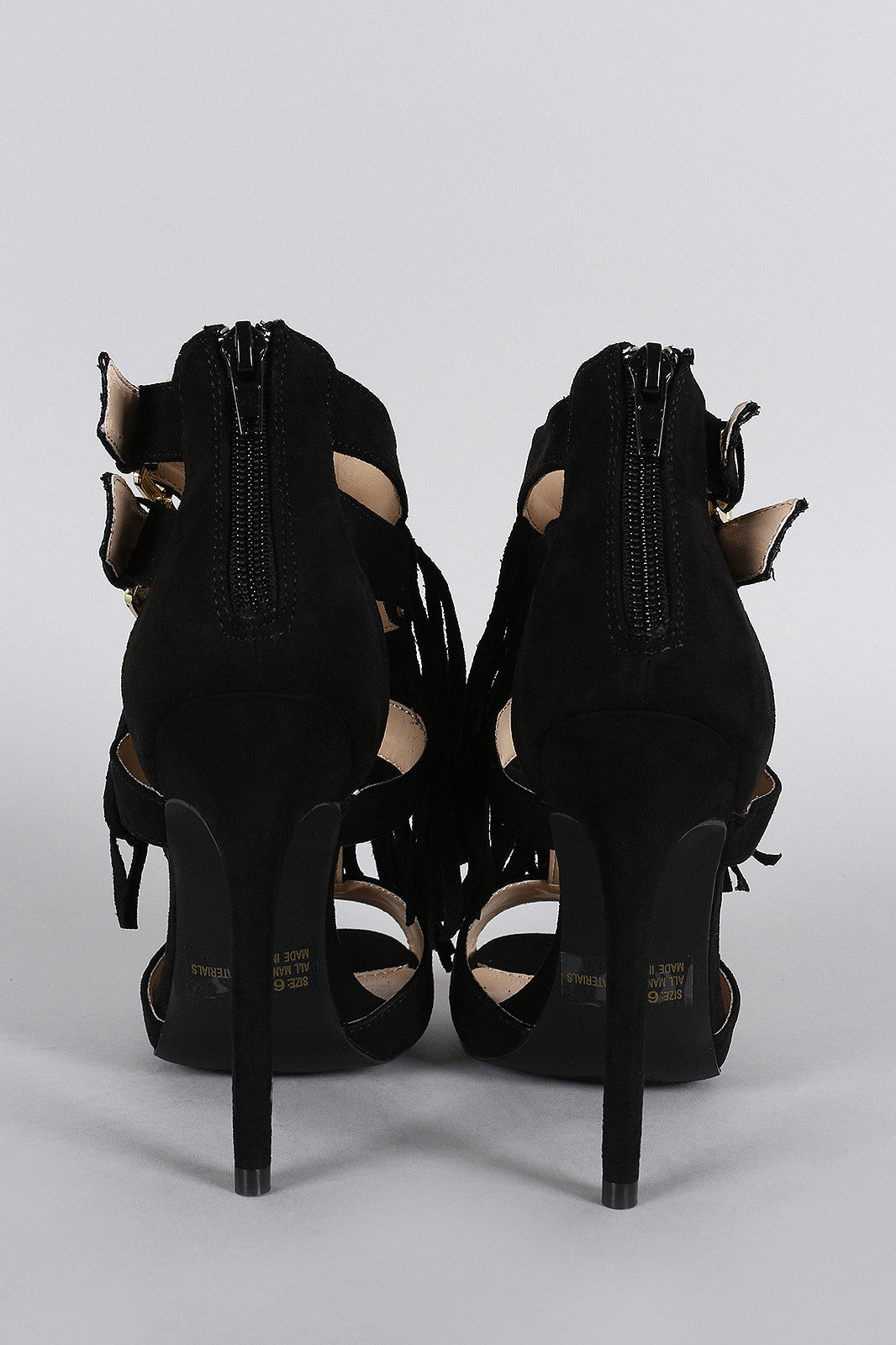 This leg-lengthening fringe falling along the vamp. Finished with a rear back zipper closure.