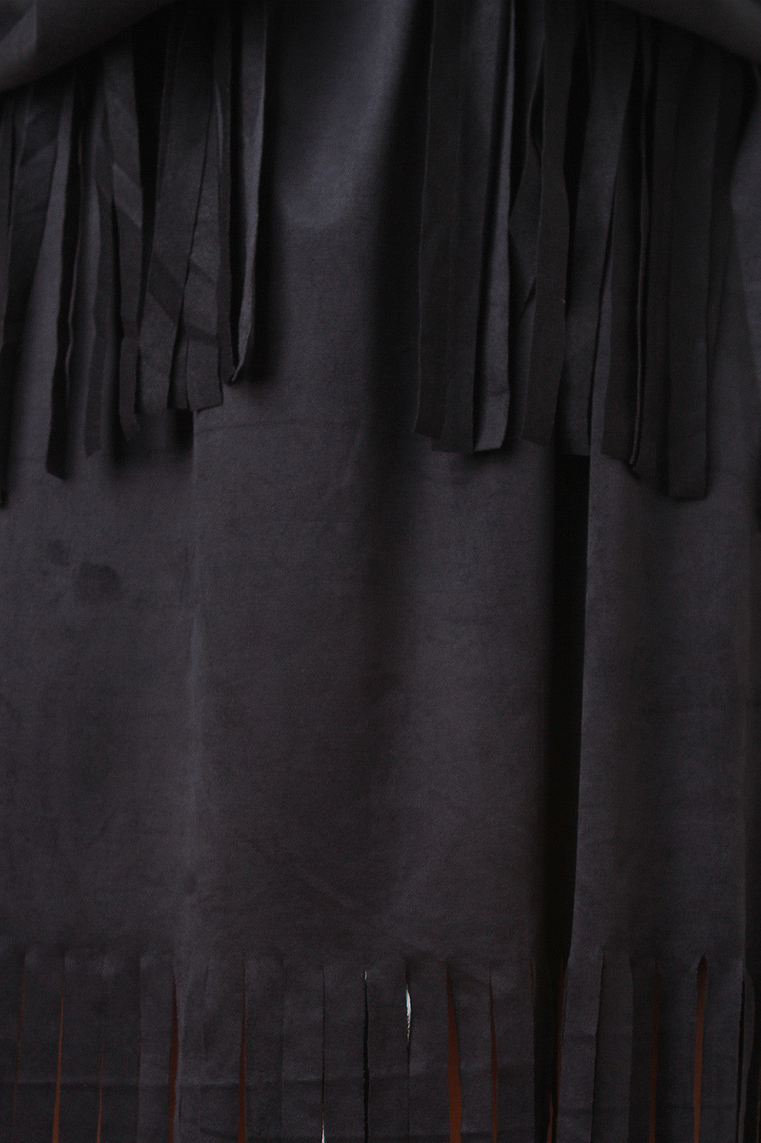 This vegan suede dress features an elasticized neckline for off the shoulder option, long bell sleeve with cascading fringe , shift cut design and complete with fringe hemline. Accessories sold separately. Made in U.S.A. 92% Polyester, 8% Spandex.