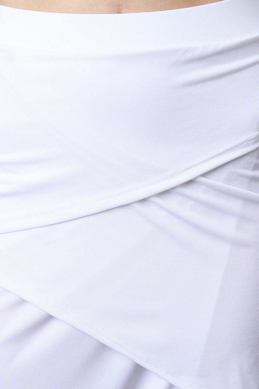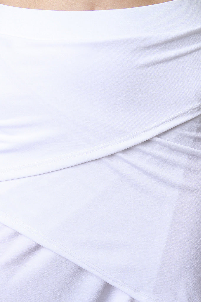 This maxi skirt features smooth stretch fabric, elasticized waist, overlap design, and open side. Accessories sold separately. Made in U.S.A. 96% Polyester, 4% Spandex.