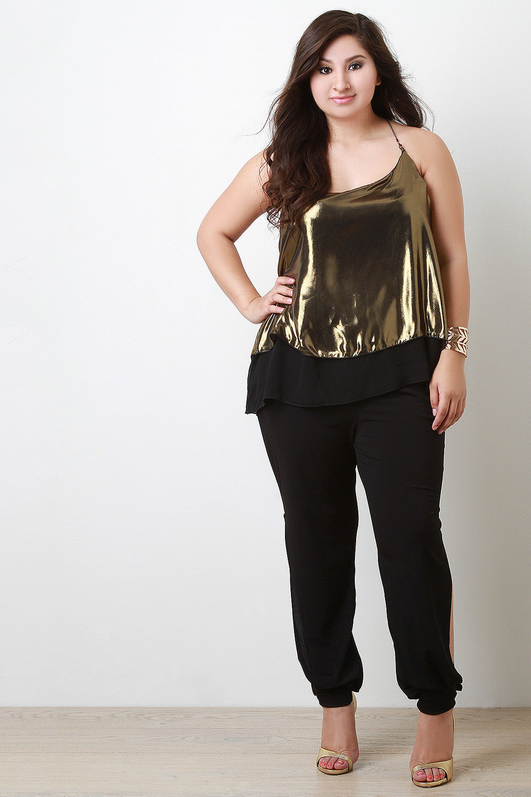 This plus size top is swing silhouette; featuring a glitter metallic sheer overlay and solid chiffon underlay. It is scooped neckline sleeveless bodice with metallic chains as straps that sweep over the shoulders. Accessories sold separately. 100% Polyester.