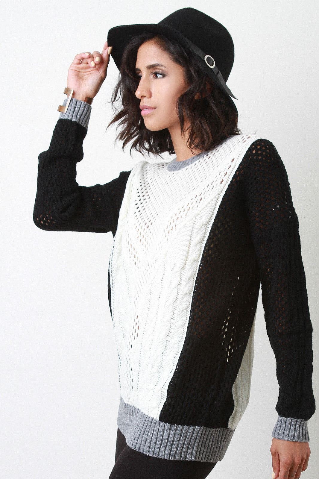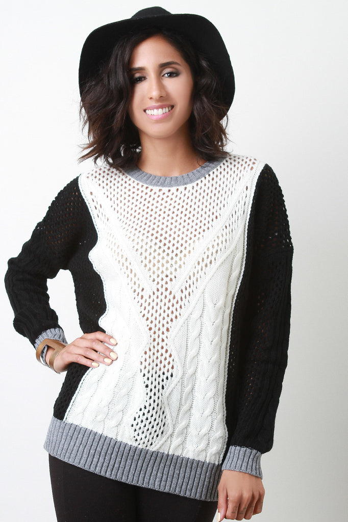 This perfect tricolor sweater features a round neckline, long sleeves, loose knit eyelet center, cable knit accent, and contrasting sculpturing sides. Accessories sold separately. 100% Acrylic.