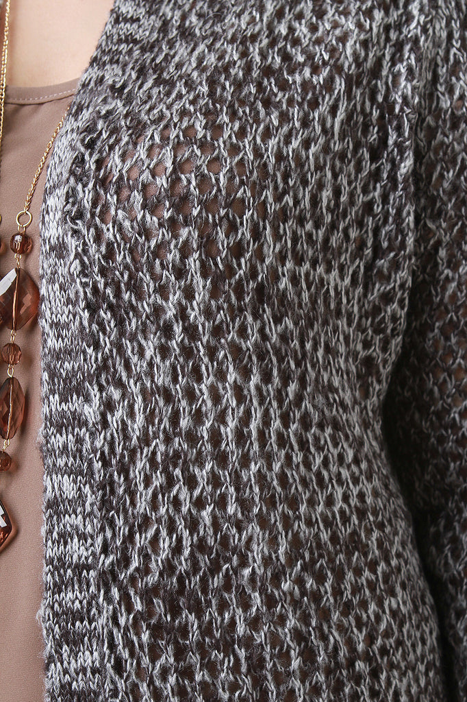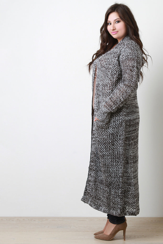 This longline plus size cardigan features a loose knit construction, open front, long sleeves, and side pockets. Accessories sold separately. 100% Acrylic.