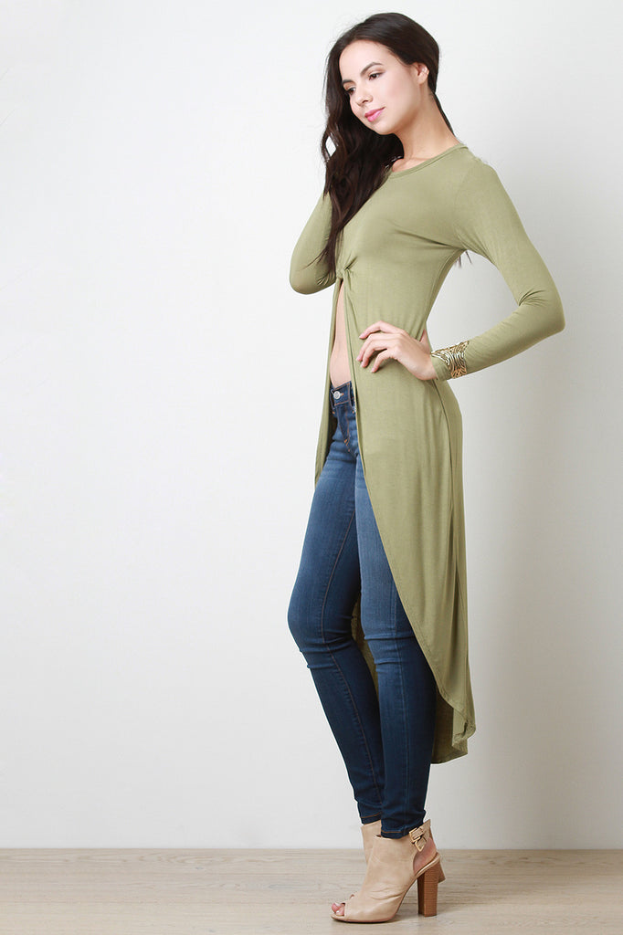 This jersey knit top features a round neckline, long sleeves, strategically place center seam, crop construction to a high-low hemline and a knotted front design. Accessories sold separately. Made in U.S.A. 95% Rayon, 5% Spandex.