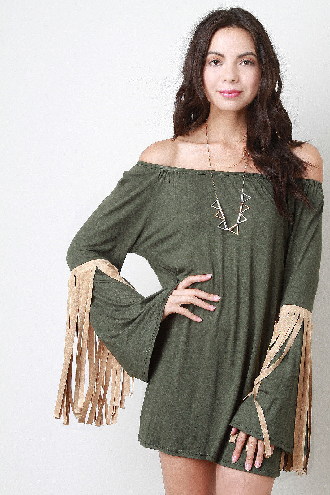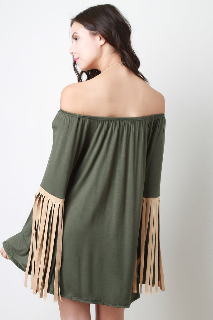 Off Shoulder Suede Contrast Fringe Long Bell Sleeves Top