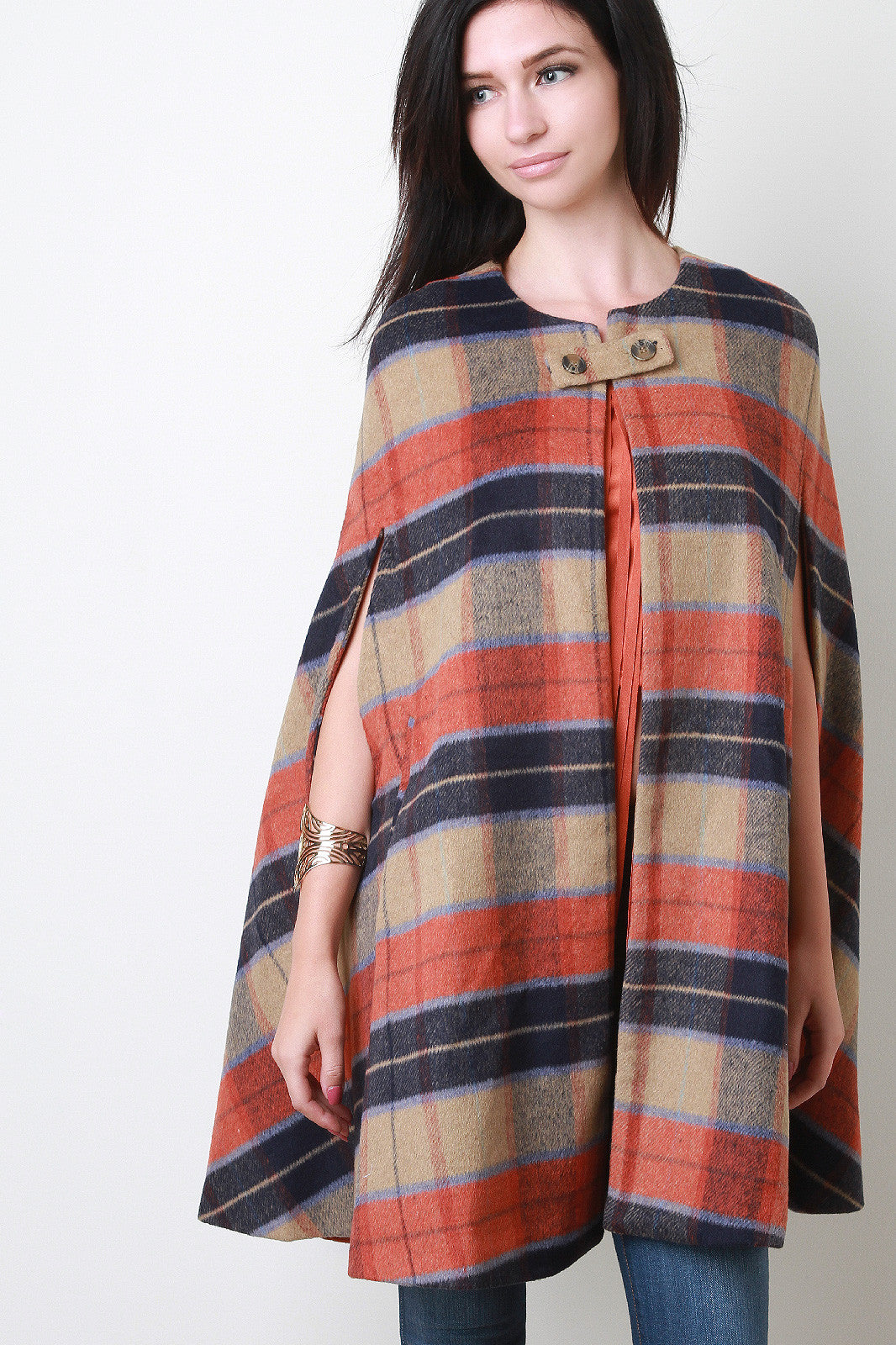 This cozy chic cape features a round neckline, open front with button tab secure closure at yoke, armhole slits, side pockets, plaid pattern design on wool-like fabrication, and fully lined. Accessories sold separately. 100% Polyester.