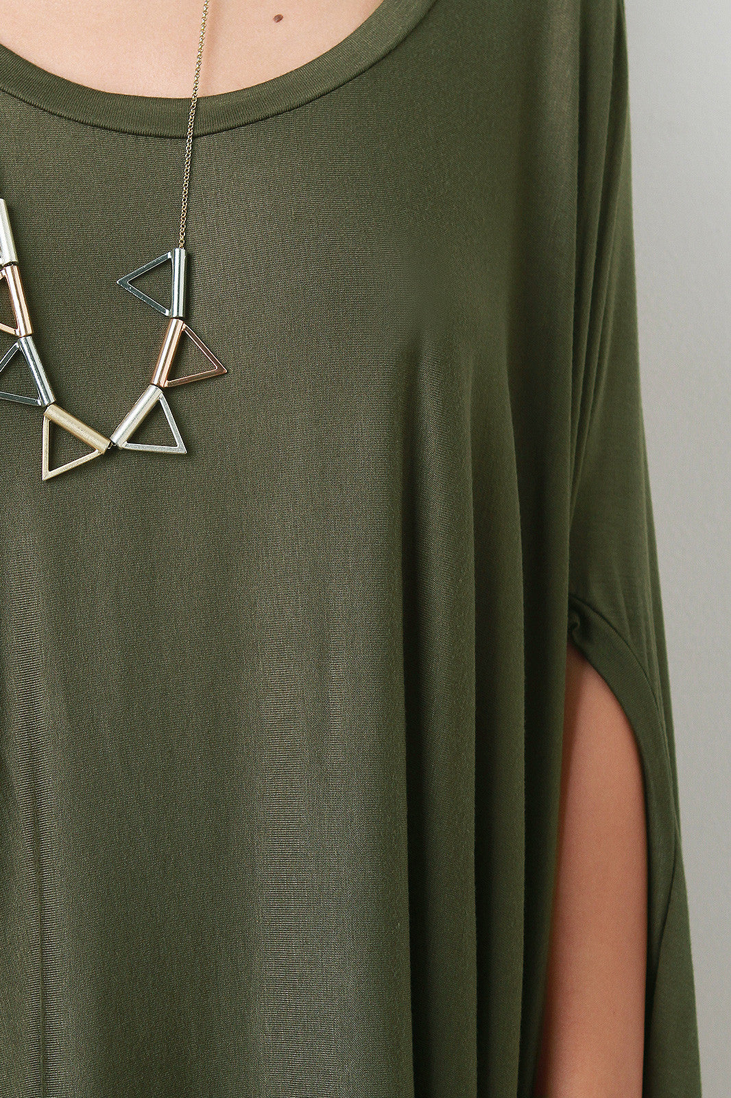 This poncho inspired trapeze top features a round neckline, arm hole opening, and a sharkbite hemline. Accessories sold separately. Made in U.S.A. 97% Rayon, 3% Spandex.