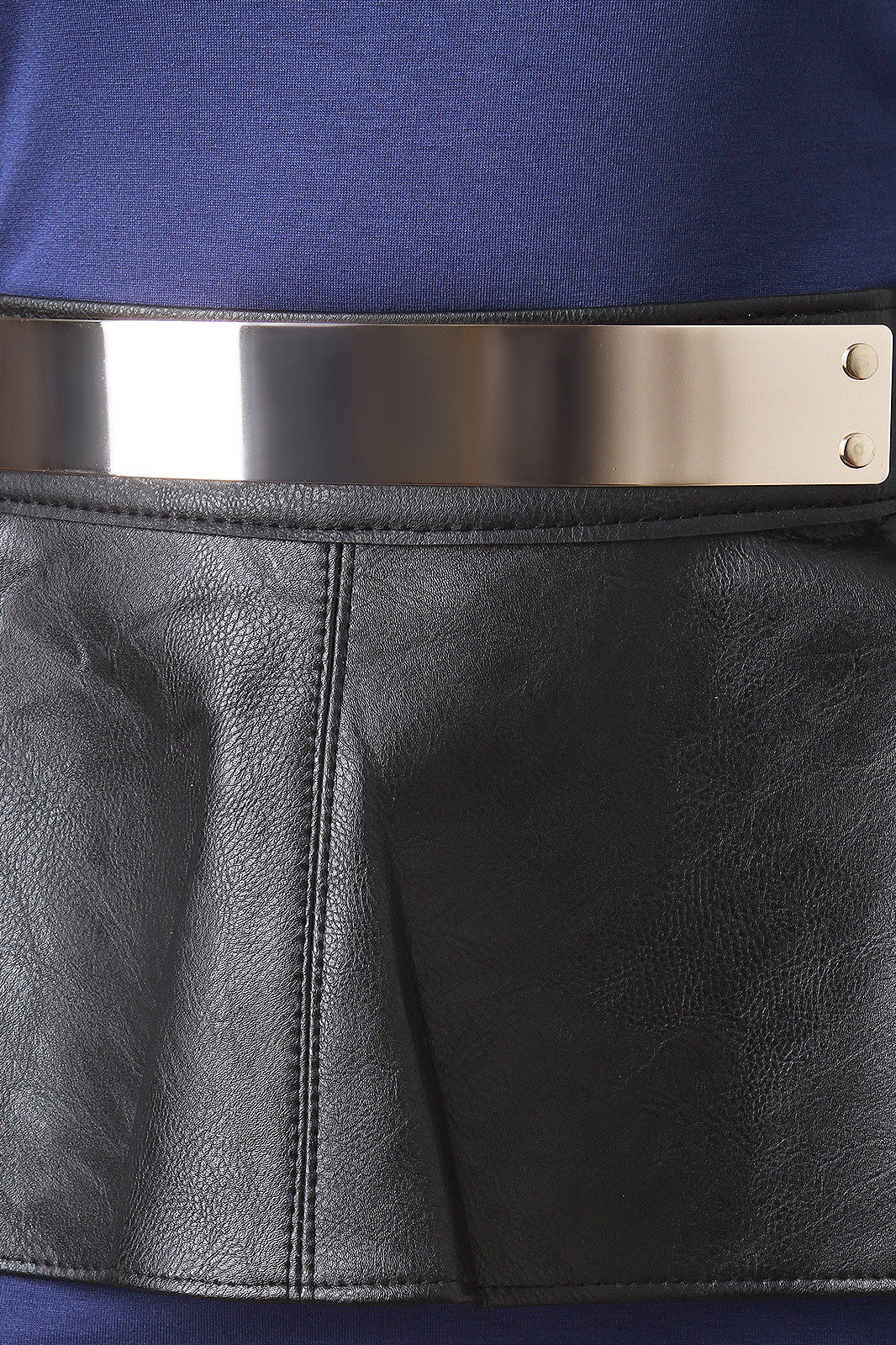 Add some peplum flare to any bodycon outfit! Featuring a glossy metal plate skirt . Finished with rivets, stitching detail, and self-tie back. One size fits most. 90% PVC, 10% Iron.
