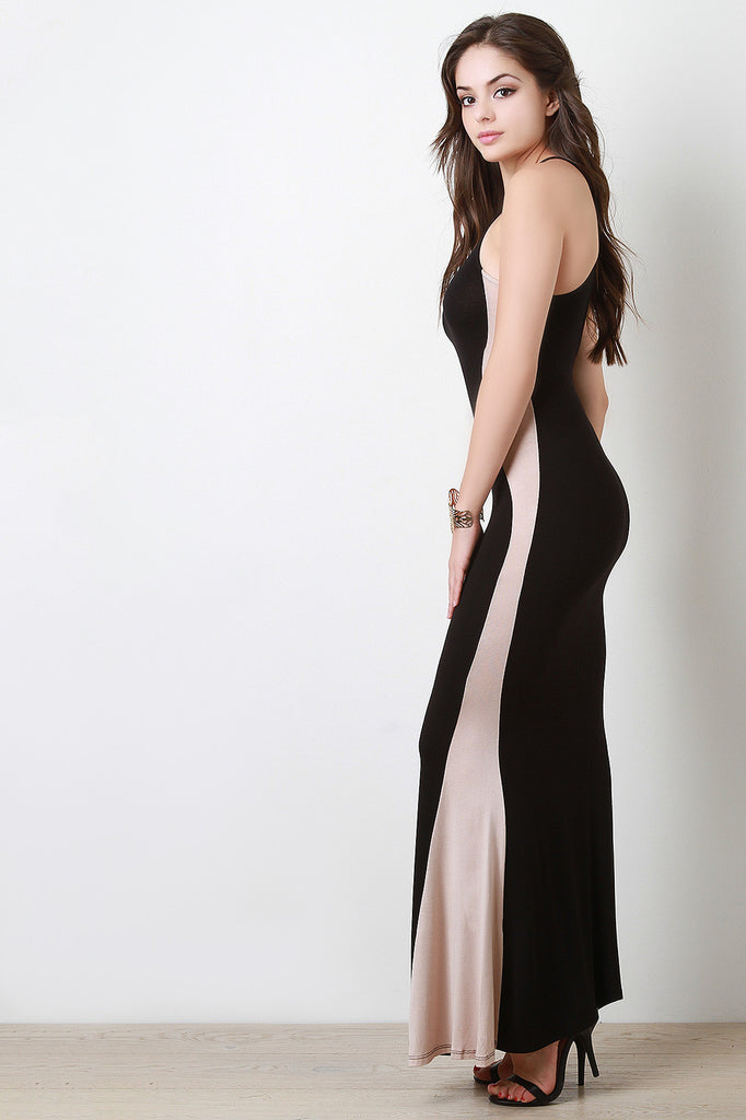 This maxi dress features soft jersey knit, round neckline, spaghetti straps, contrast curved panels for a sculptured look, and finished with flared bottom. Accessories sold separately. 95% Rayon, 5% Spandex. Cont: 95% Rayon, 5% Spandex.