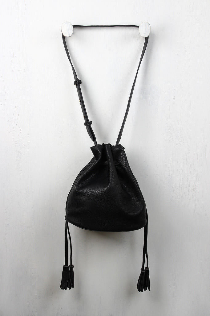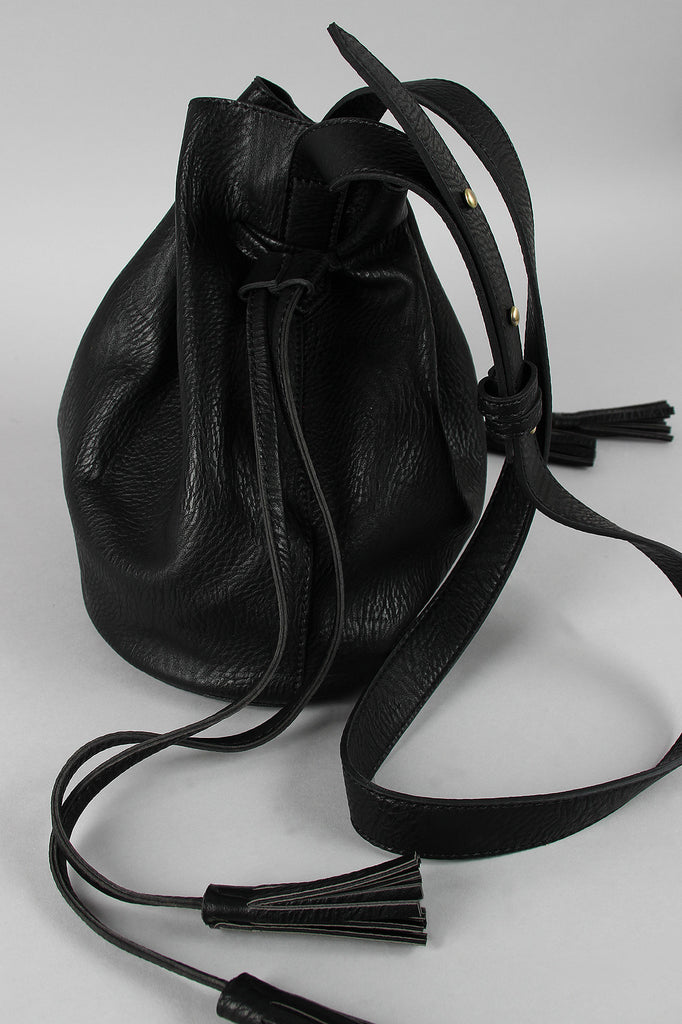 This vegan leather bucket bag features two side drawstring closures with tasseled ends, a suede-like interior, and a structured bottom. The shoulder strap has a 19" drop and is adjustable with push studs.