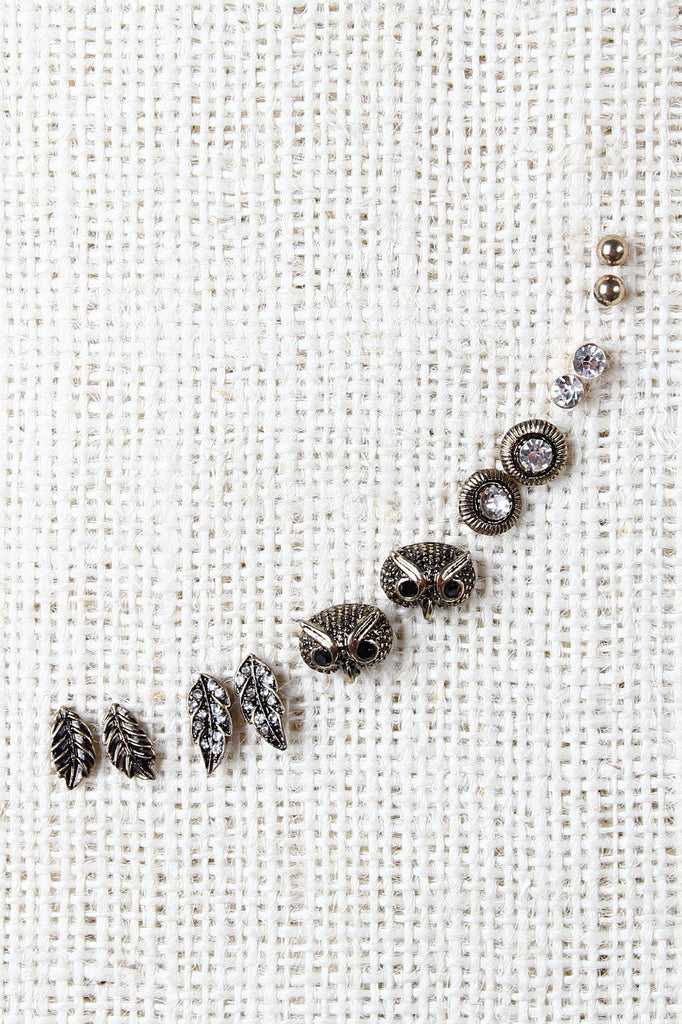 This set of six pairs of earrings features textured owl head studs, along with leaf shapes, rhinestone accents, and round studs on post backs.