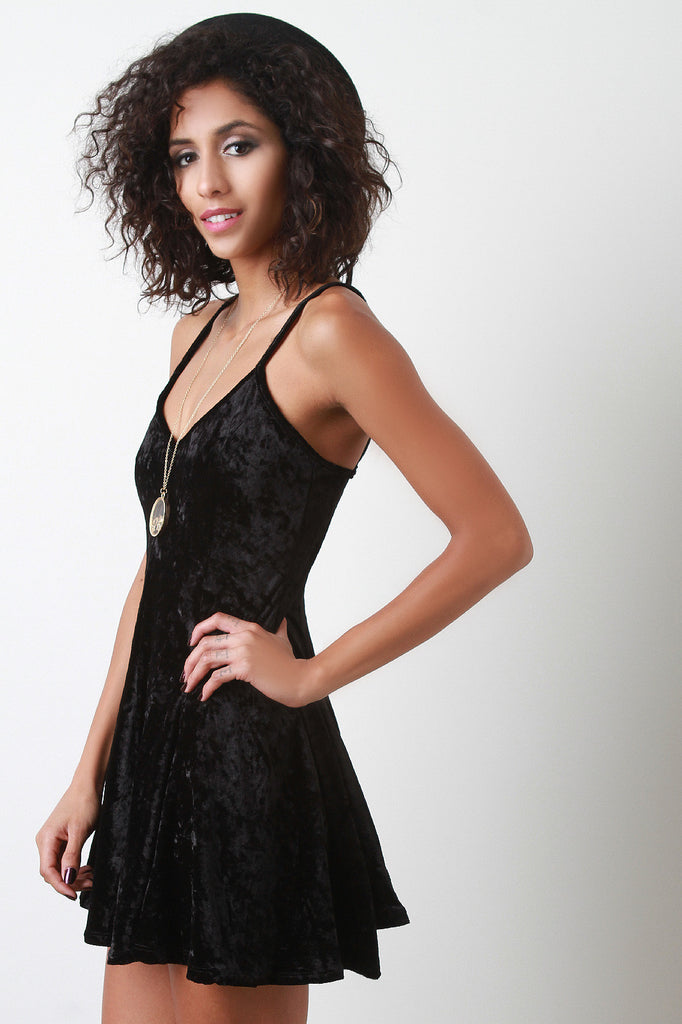 This velvet skater dress features thin shoulder straps, a v-neckline, fitted bodice, and a flared skirt. Accessories sold separately. 96% Polyester, 4% Spandex.