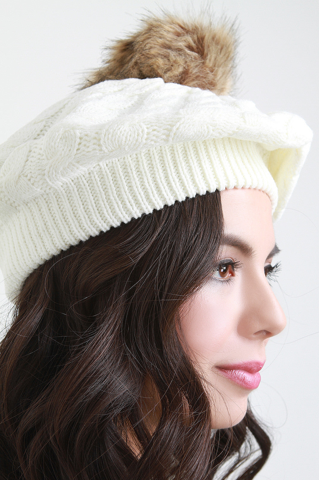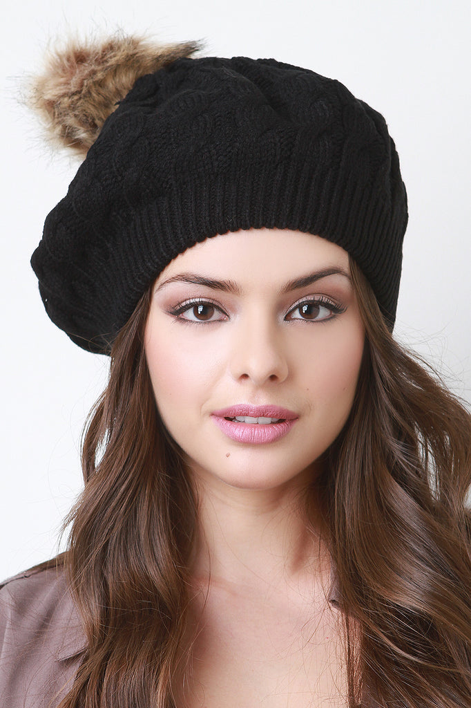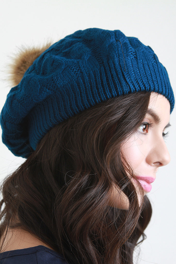 This cable knit beret features a large faux fur pom pom at the top and elasticized rim. 100% Acrylic.