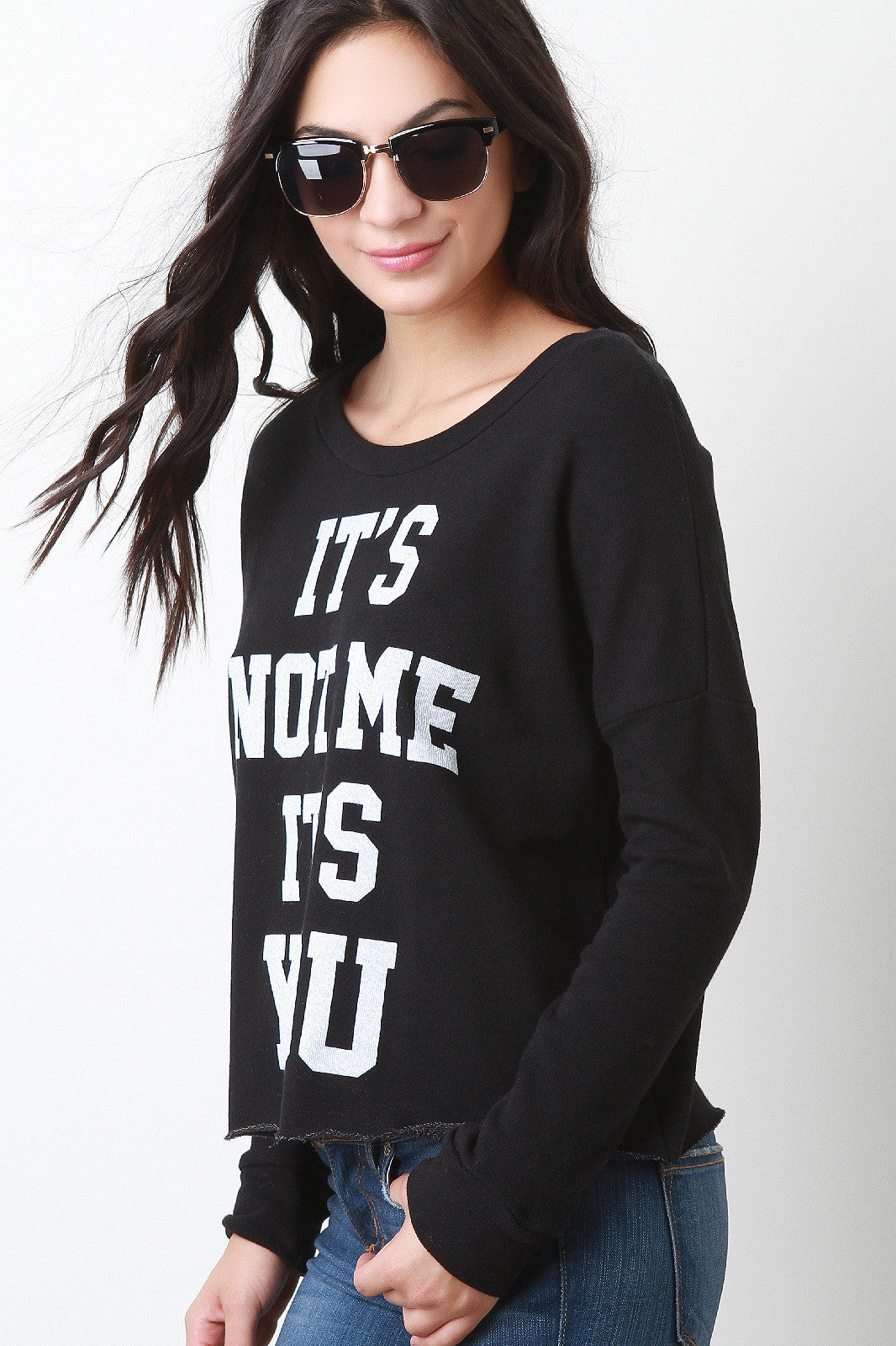 This casual sweatshirt top features a crew neckline, jersey knit fabrication with IT'S NOT ME IT'S YOU graphic print, and long sleeves design. Finished with raw hemline. Accessories sold separately. Made in U.S.A. 88% Cotton, 12% Polyester.