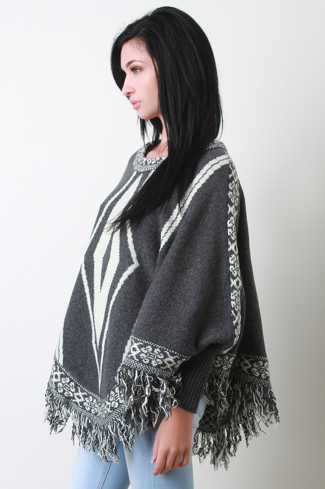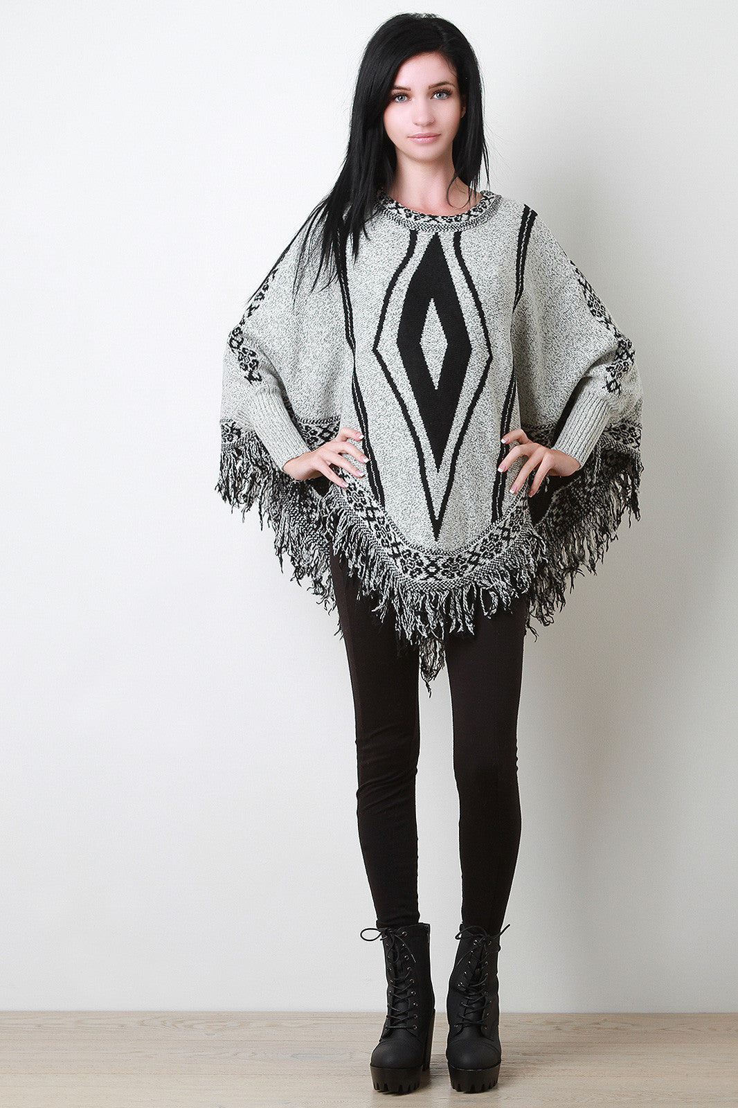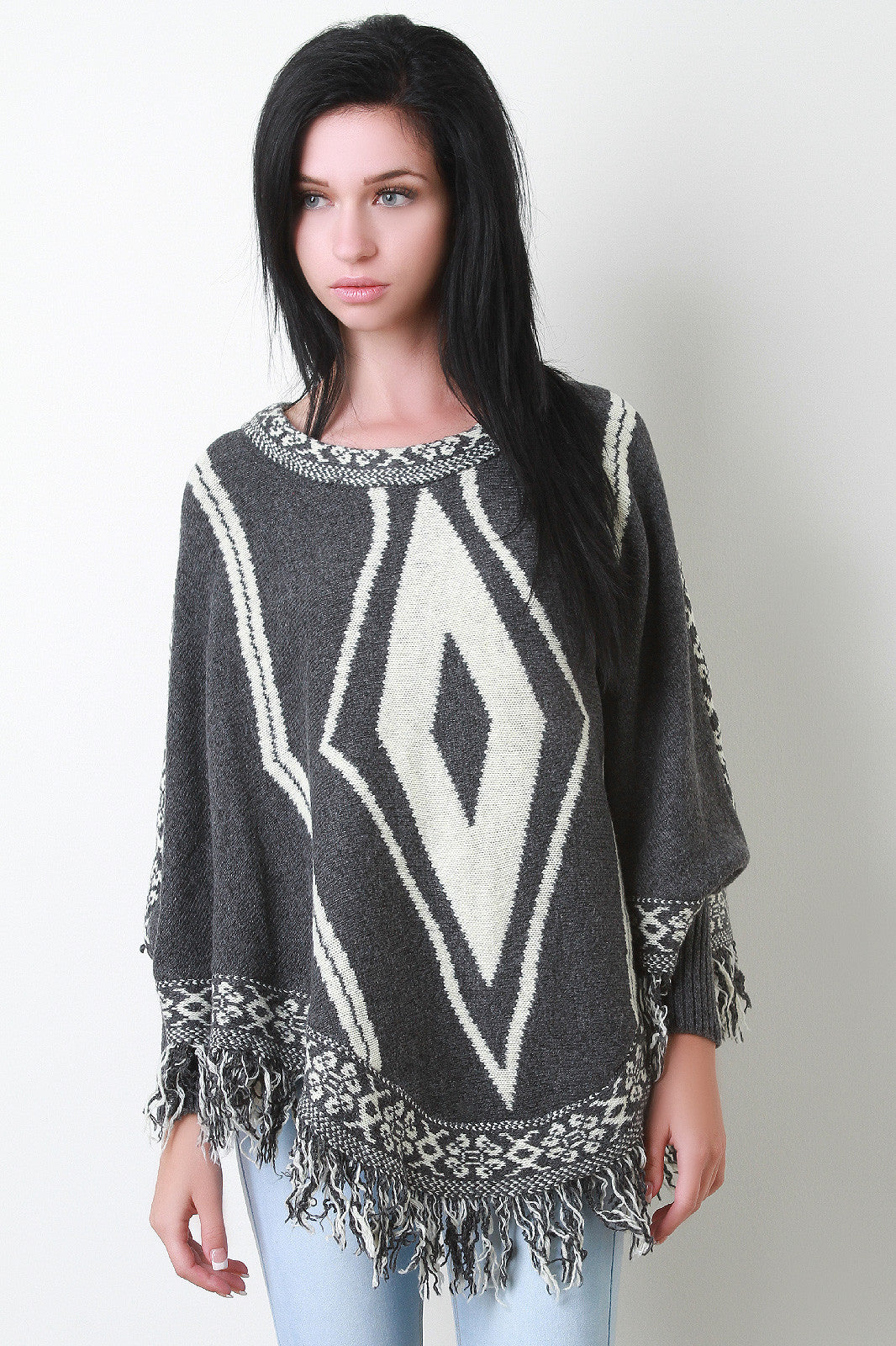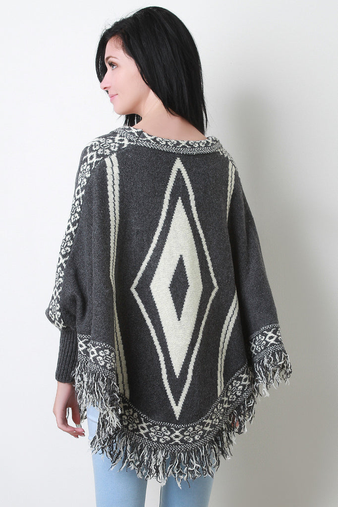 Fringe Hem Marled Knit Tribal Pattern Poncho