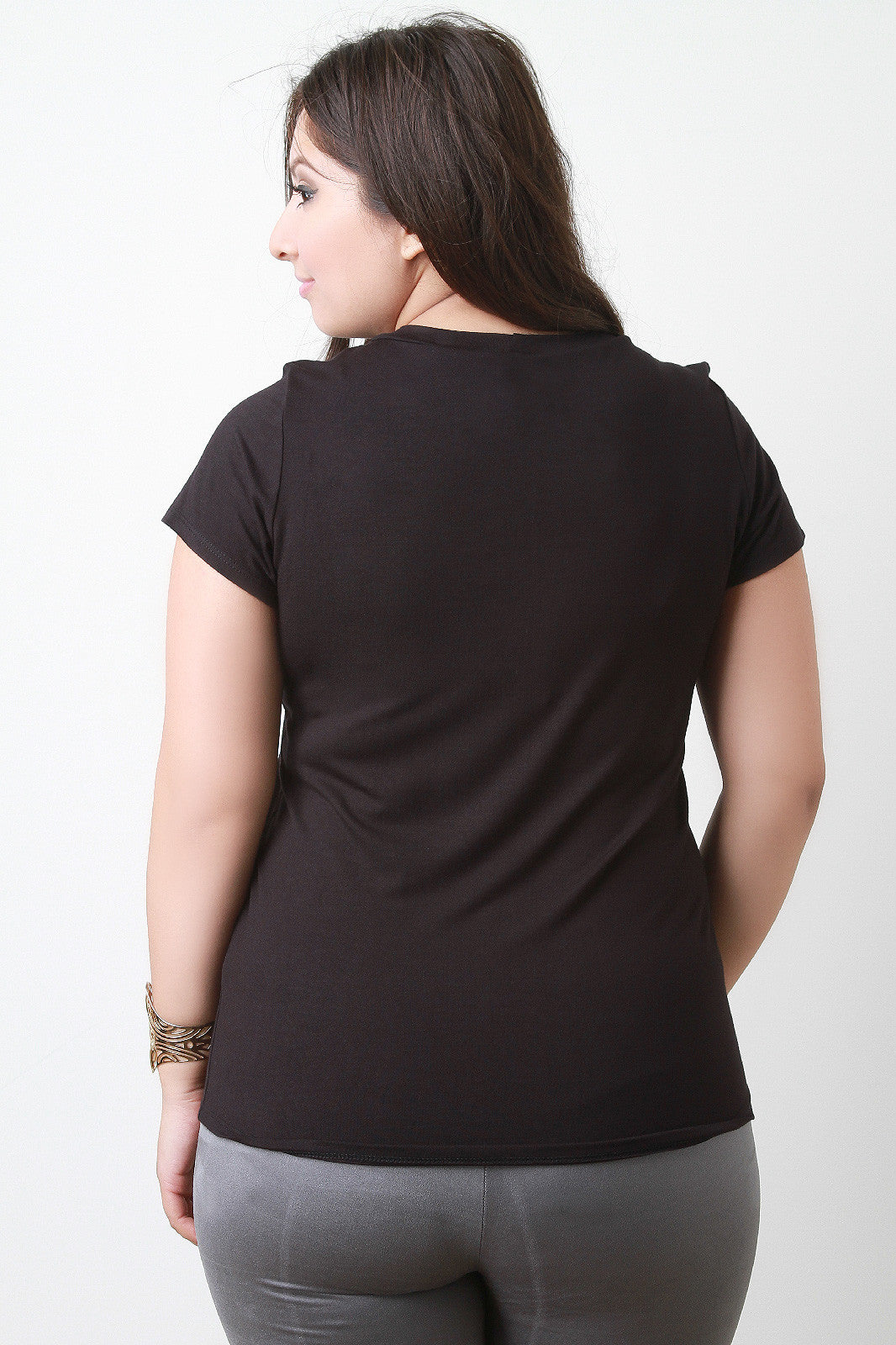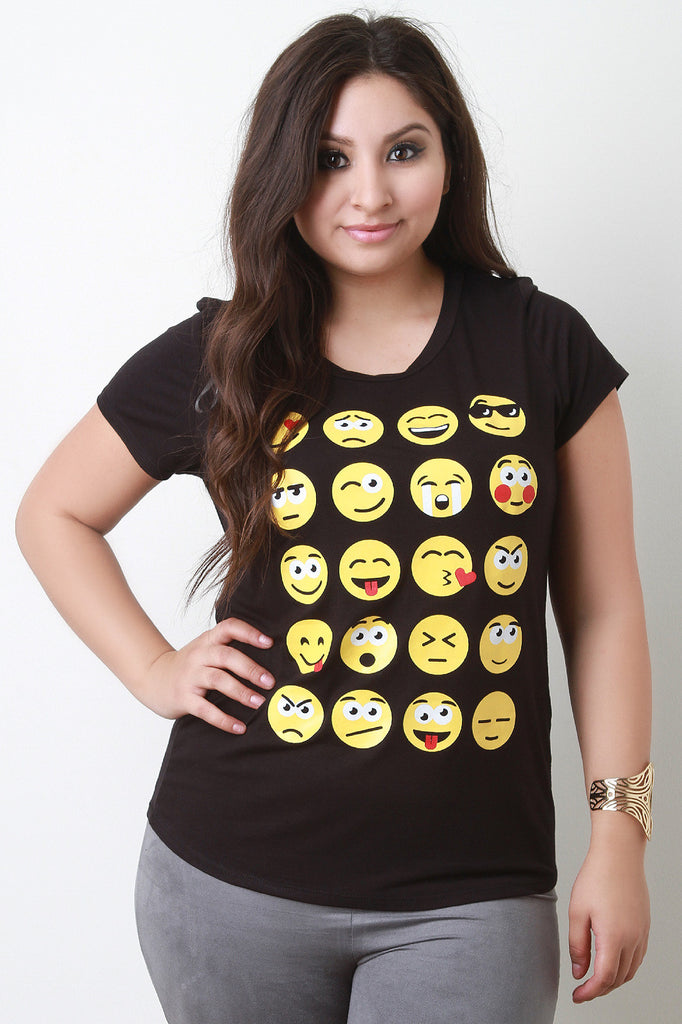 This plus size tee features an emoji print front, crew neckline, and short sleeves. Accessories sold separately. Made in U.S.A. 97% Polyester, 3% Spandex.