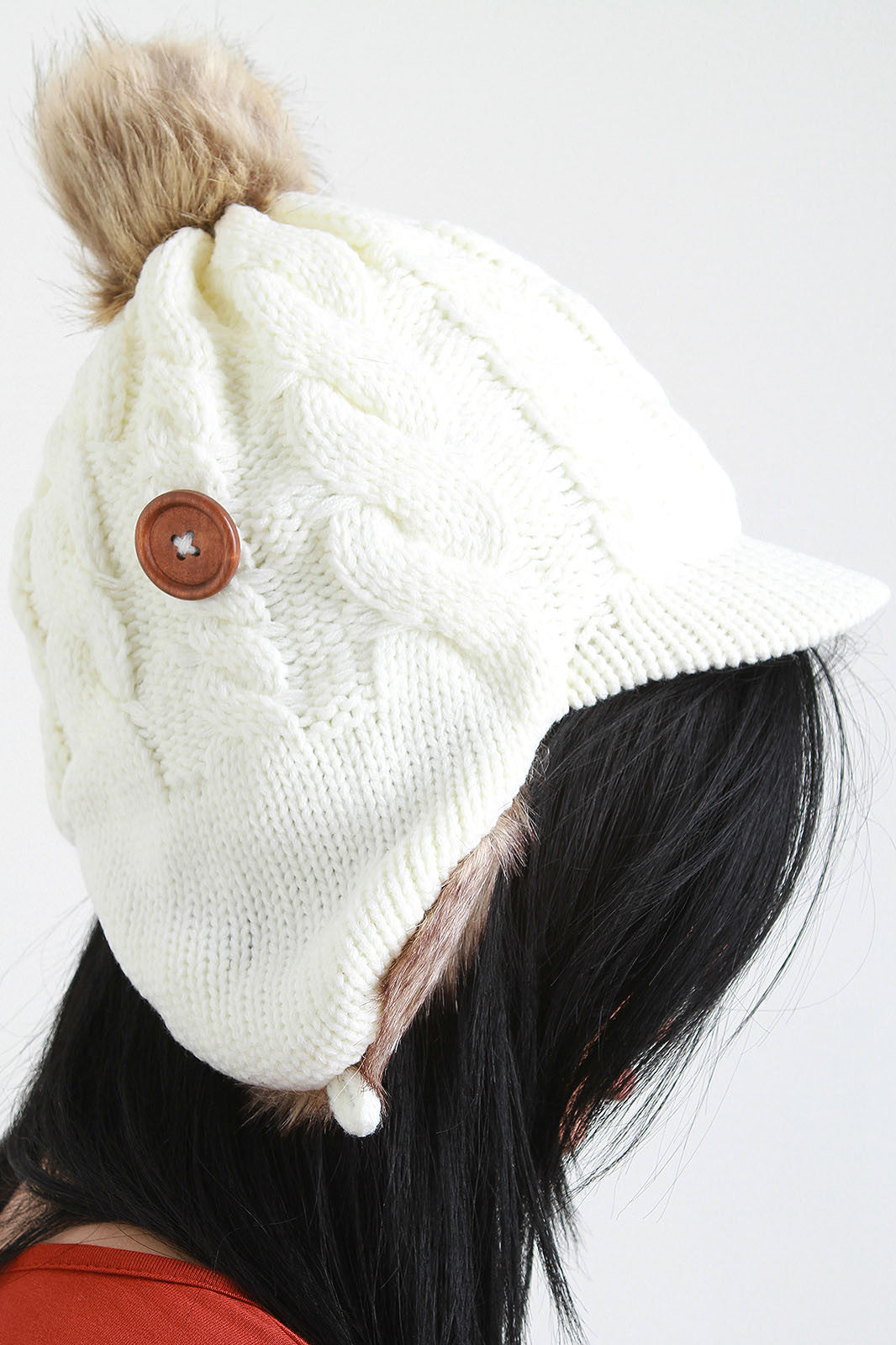 A warm hat featuring cable knit main, faux fur pom pom and earflaps secured with large wooden buttons, and a short knit-covered bill. Finished with a fleece interior lining. 95% Acrylic, 5% Polyester.