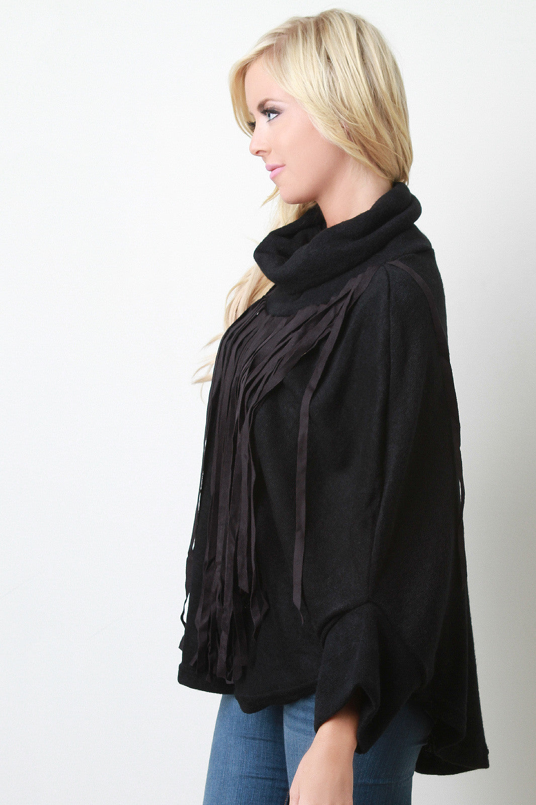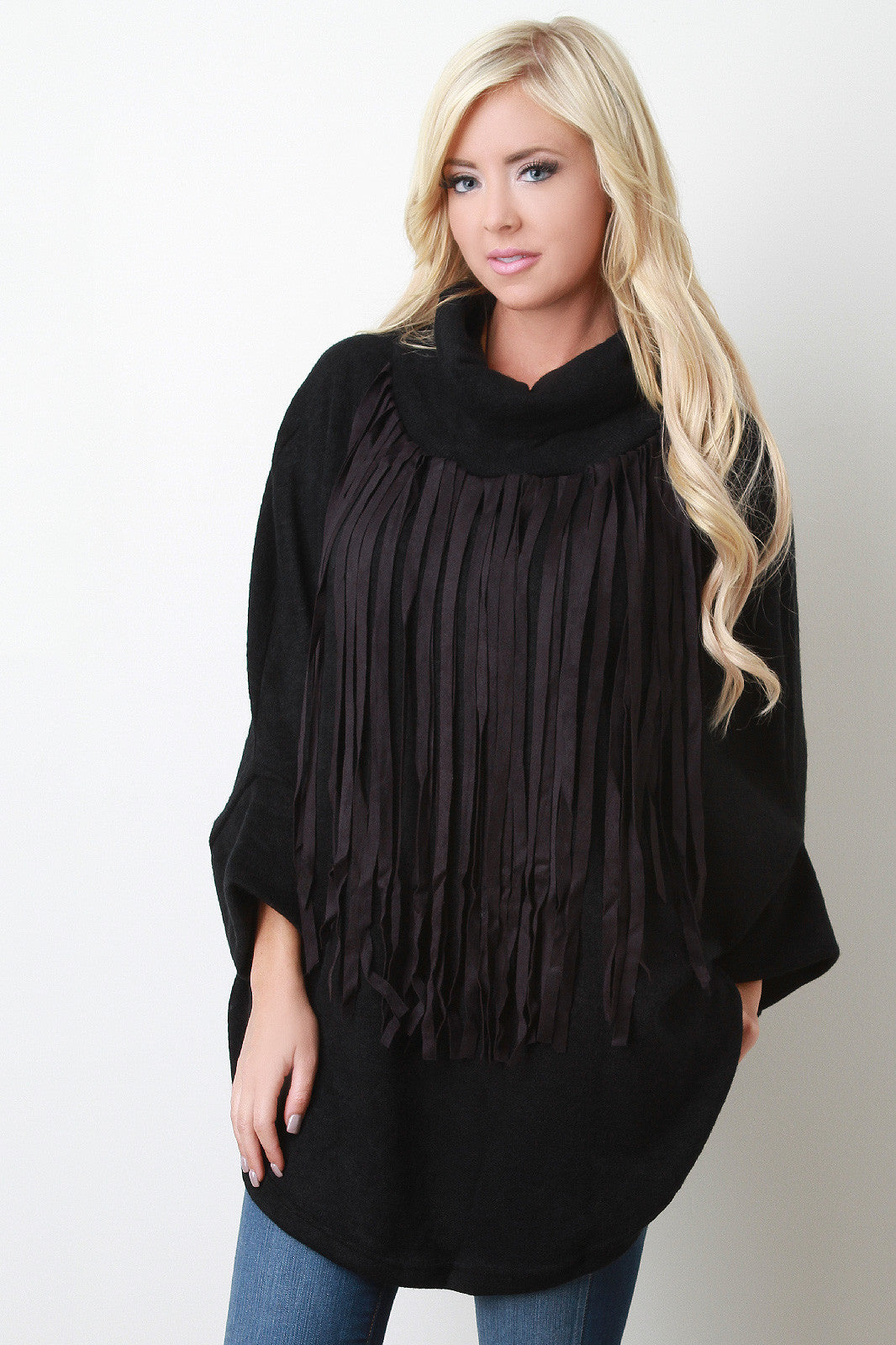 Fringe Turtleneck Round Hem Poncho Sweater
