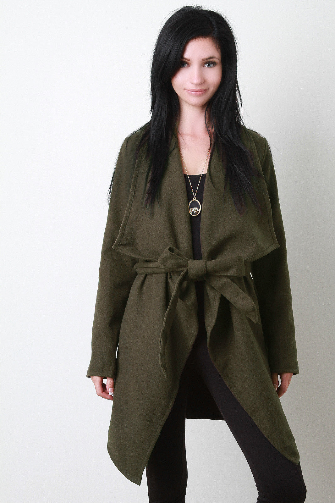 This fleece coat features an open front with large flap collar, side belt loops, self-tie waist sash, long sleeves, side pockets, and an asymmetrical hemline. Accessories sold separately. 100% Polyester.